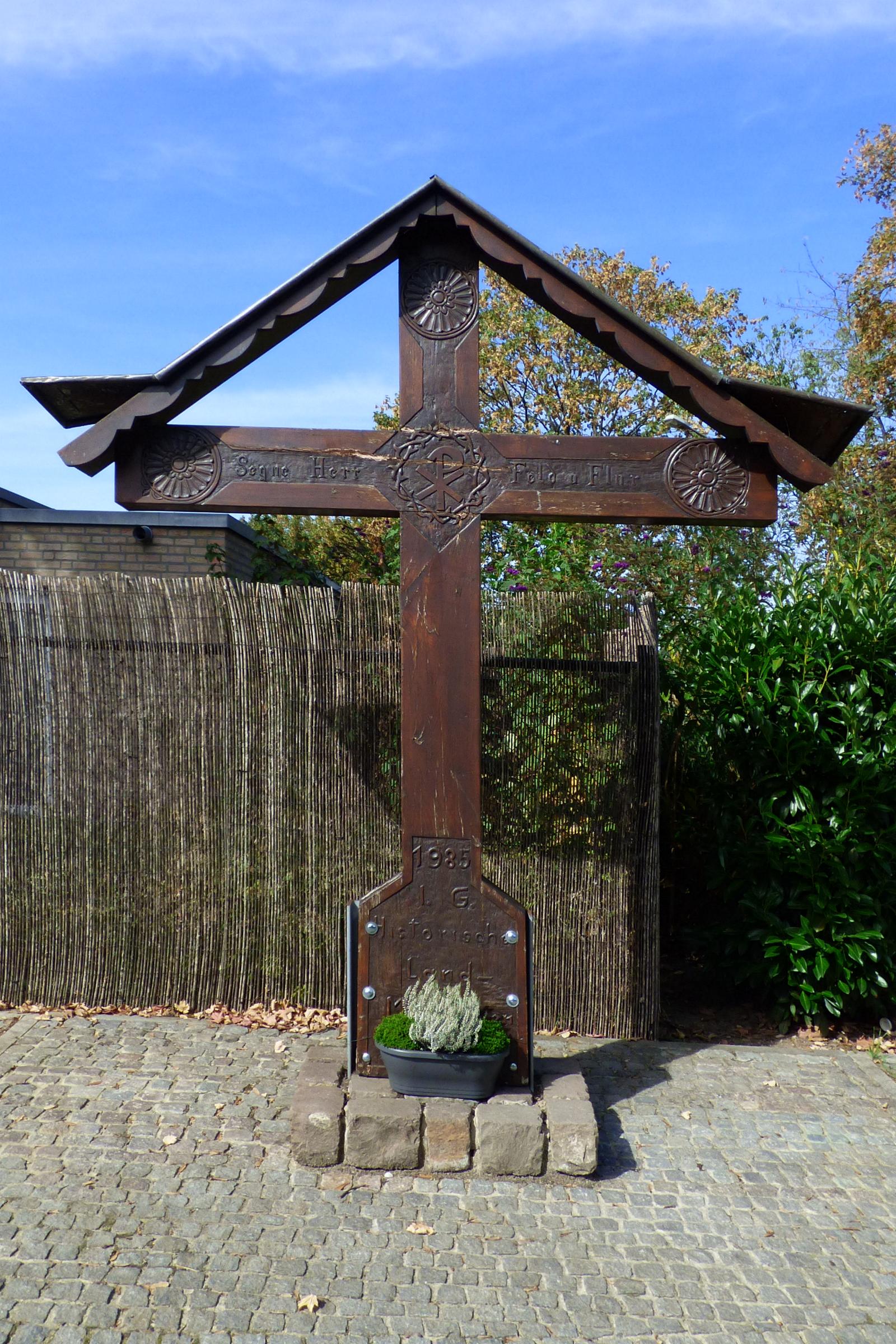 Standort: Das Wegekreuz hat seinen Standort Am Kirchenfeld, im Ortsteil Tüddern, in der Gemeinde Selfkant. Geschichte: Bei dem Wegekreuz handelt es sich um ein ca. 2,50 m hohes Holzkreuz ohne Korpus mit einer Überdachung. Das Kreuz aus dem Jahr 1985 wurde von der I. G. Historischen Landmaschienen Selfkant gestiftet. Die Inschrift lautet: S E G N E H E R R F E L D U. F L U R