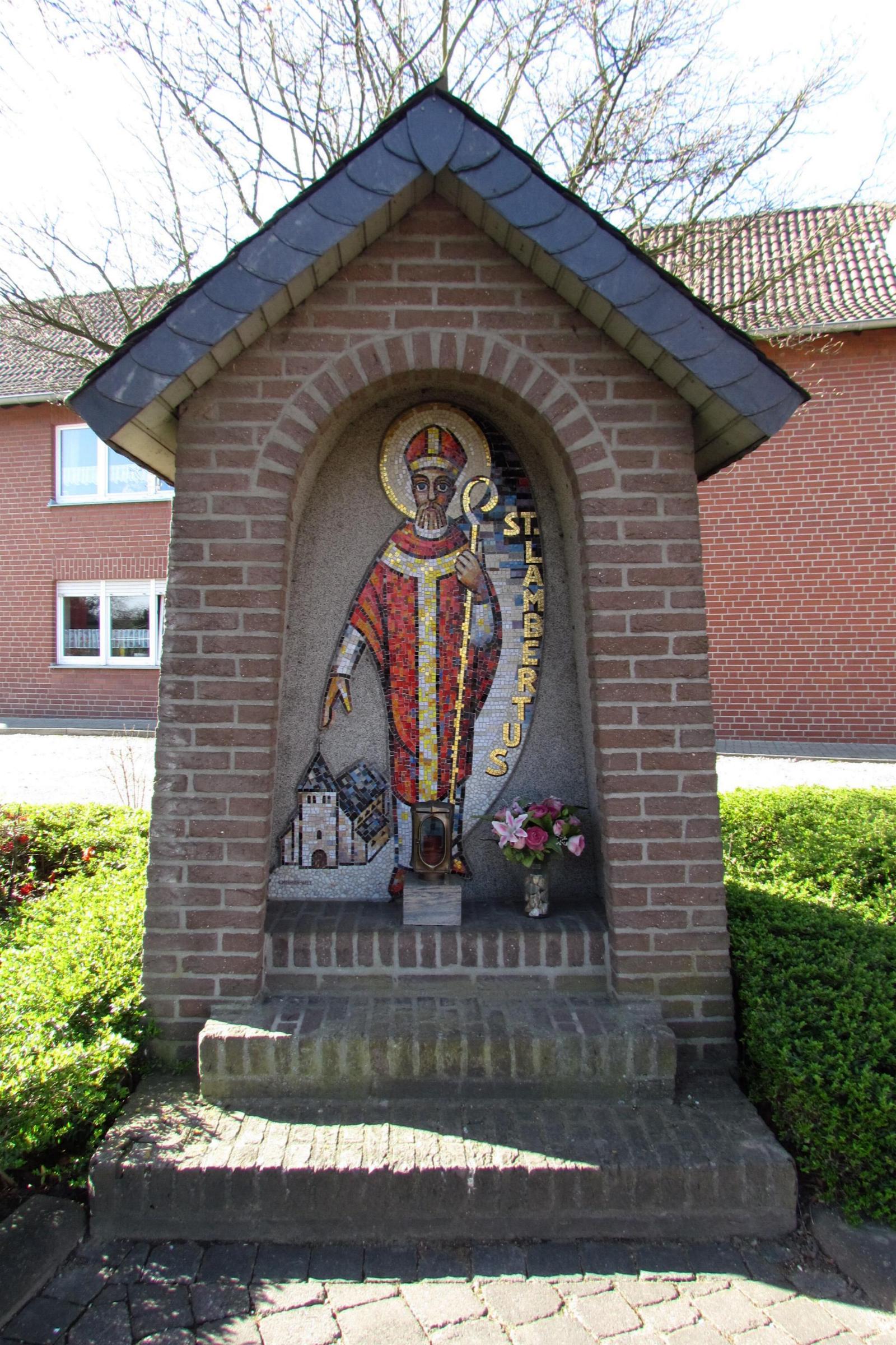 Standort: Die St. Lambertus Betkapelle befindet sich an der Straßenecke Lambertusstraße / Elsumer Weg, im Stadtteil Birgelen in der Stadt Wassenberg. Beschreibung: Die Betkapelle besteht aus einem ummauerten Betonkern mit einem geschieferten Satteldach. Sie hat eine Höhe von 2,60 m, eine Breite von 1,70 m und eine Tiefe von 0,80 m. An der Rückwand der rundbogigen Betkapelle befindet sich ein 1,50 m hohes, buntes Mosaikbild des St. Lambertus. Früher stand an dieser Stelle seit 1874/75 eine Ortskapelle, die beim Ausbau der L 117 im Jahr 1953 abgebrochen werden mußte. Die neue Kapelle wurde nach einem Entwurf des Architekten Hans Deckers gebaut. Die Mosaik-Rückwand gestaltete der Künstler Gerd Meehsen aus Welz bei Jülich. Die Kapelle wurde am Sonntag, dem 12. September 1982 geweiht. Quellenhinweis: * Verzeichnis: Christliche Kleindenkmale im Kreis Heinsberg (Birgelen Nr. 14) * Kapellchen und Wegekreuze rund um Birgelen v. Franz Josef Breuer (HK. 2001 S. 109-113)