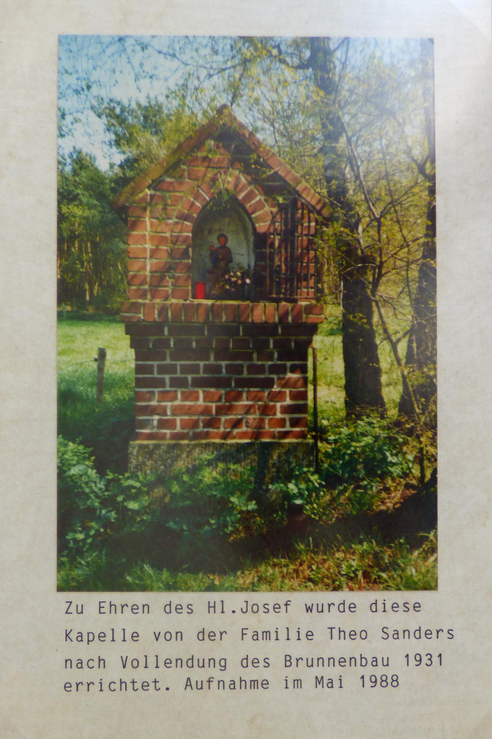 (Foto und Text: Maria Sanders) Beschreibung: Der Bildstock besteht aus einem Kunststeinsockel, gemauerten Ziegelsteinen mit einer Spitzbogenöffnung und einem Gittertürchen. Er ist 2,00 m hoch, 1,10 m breit und hat eine Tiefe von 0,70 m. Die Errichtung des Bildstocks geht auf ein Gelübde des Bauern Sanders zurück, als er in den 30er Jahren sein Wohnhaus errichtete. Beim Brunnenbau gelobte er, wenn er auf Wasser stoßen würde, ein Steinhäuschen zu errichten. Nach längeren Grabungen stieß man plötzlich auf so viel Wasser, daß Bauer Sanders Mühe hatte, aus dem Brunnenschacht herauszukommen. Quellenhinweis: * Verzeichnis: Christliche Kleindenkmale im Kreis Heinsberg (Birgelen Nr. 11) * Bild: 17. Mai 1988 und Textseite rechts von Maria Sanders