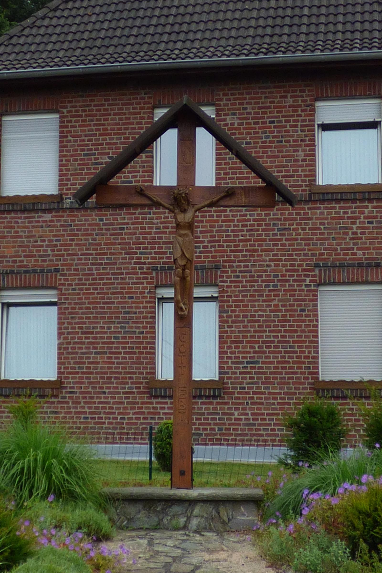 Standort: Das Wegekreuz hat seinen Standort am Pützchensweg, am Aufgang zum Friedhof, im Stadtteil Birgelen in der Stadt Wassenberg. Beschreibung: Das Holzkreuz steht auf einem Natursockel mit einer Höhe von 3,80 m, einer Breite von 1,70 m und einer Tiefe von 0,14 x 0,20 m. Eine Dachabdeckung schützt das Kreuz vor Witterungseinflüsssen. Auf dem oberen Kreuzbalken steht das Wort INRI, unterhalb des Korpus: "Gott lebt". Das Kreuz stand ursprünglich an der Ecke Sandstraße / Mühlenstraße, wo es am 14. Dezember 1952 eingeweiht wurde. Der Korpus wurde von dem Birgelener Schreiner Peter Deckers geschnitzt. Bei Errichtung des neuen Mahnmales wurde das Kreuz 1959 an seinem jetzigen Standort aufgestellt. Quellenhinweis: * Kapellchen und Wegekreuze rund um Birgelen v. Franz Josef Breuer (HK. 2001 S. 109-113) * Dritte Ausgabe 1994: Handbuch des Bistums Aachen ISBN 3-87448-172-7 S. 792 * Verzeichnis: Christliche Kleindenkmale im Kreis Heinsberg (Birgelen 5)