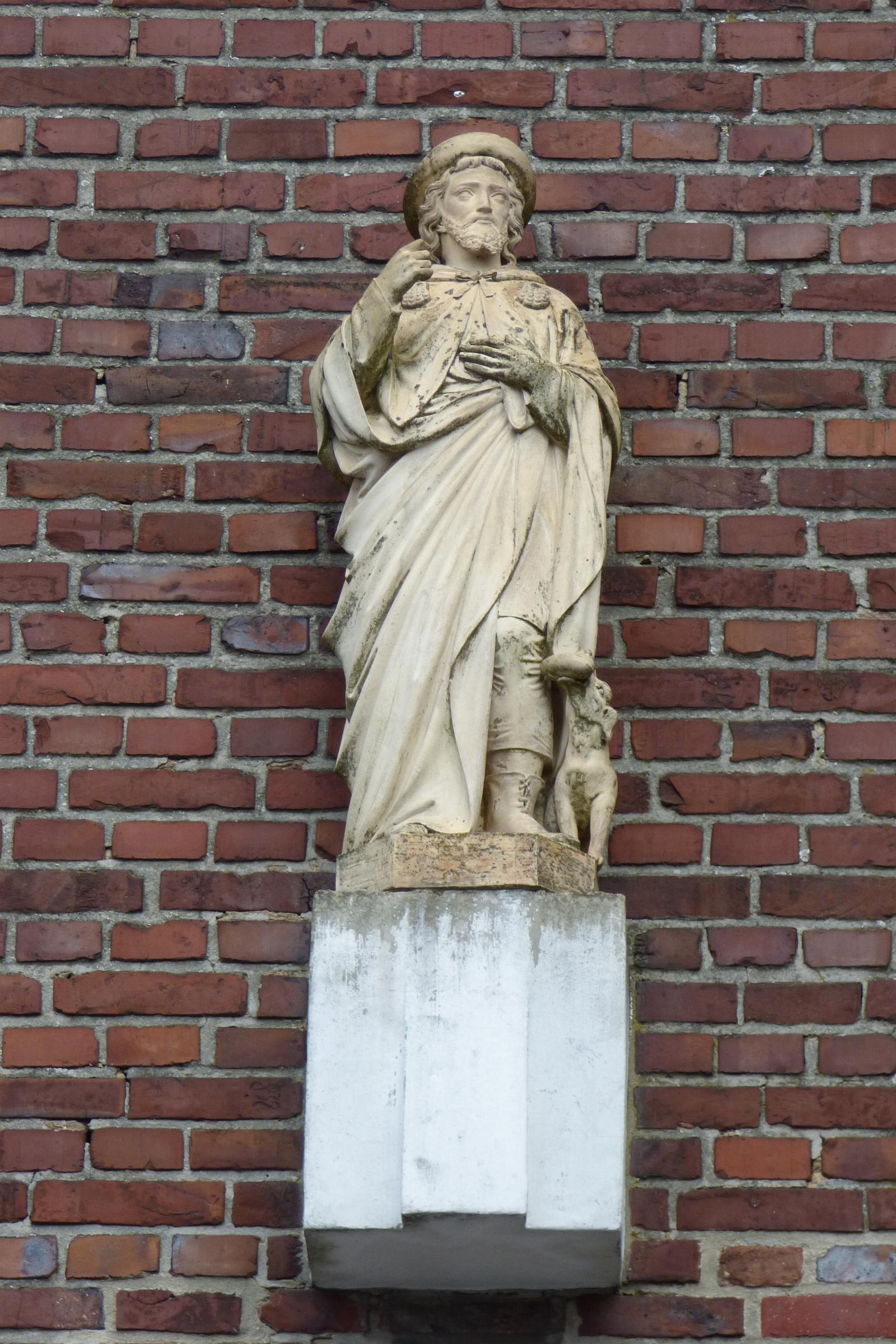 Standort: Die Figur des Heiligen Rochus befindet sich an der Giebelwand der Kirche in Dalheim, in der Stadt Wegberg. Sie steht auf einem Ziersockel. Hinweis: * Der Schutzpatron St. Rochus von Montpellier auf Wikipedia