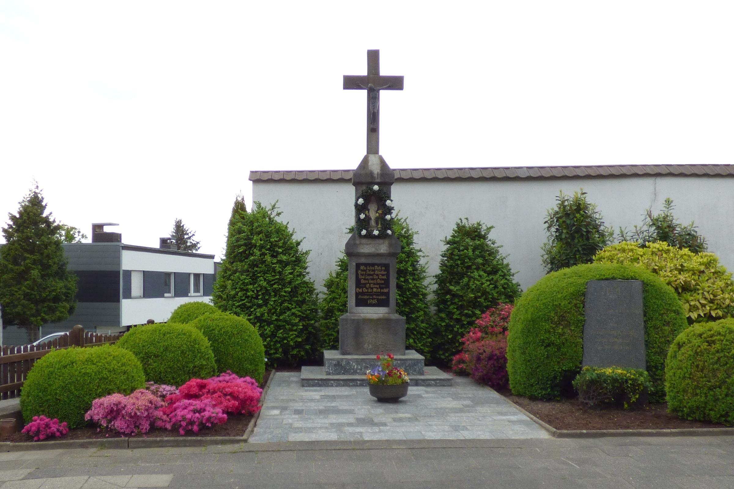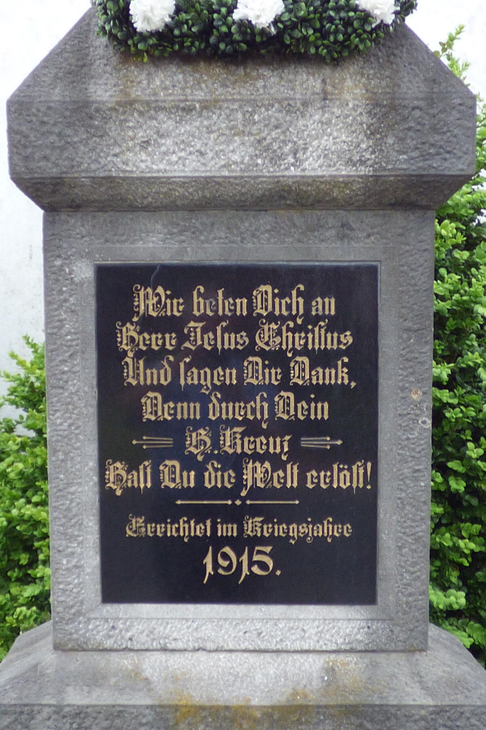 Inschrift: "Wir beten Dich an Herr Jesus Christus Und sagen Dir Dank. Denn durch Dein H. Kreuz Hast Du die Welt erlöst." errichtet im Kriegsjahr 1915 Standort: Das Gedenkkreuz steht an der Bahnhofstraße, im Ortsteil Dorp, in der Stadt Wegberg, im Kreis Heinsberg. Es steht mit der Nr. 149 in der Denkmalliste der Stadt Wegberg unter Denkmalschutz. Das Kreuz hat eine Höhe von 3.55 m. Denkmalbeschreibung: Namurer Blausteinkreuz mit Zinkgußkorpus; errichtet im Kriegsjahr 1915; Bildhauer: H. Verbocket, M. Gladbach-Dahl. Im Kreuzfuß Mariennische mit Gipsplastik, Madonna dargestellt. Sockel mit Granitinschrifttafel.