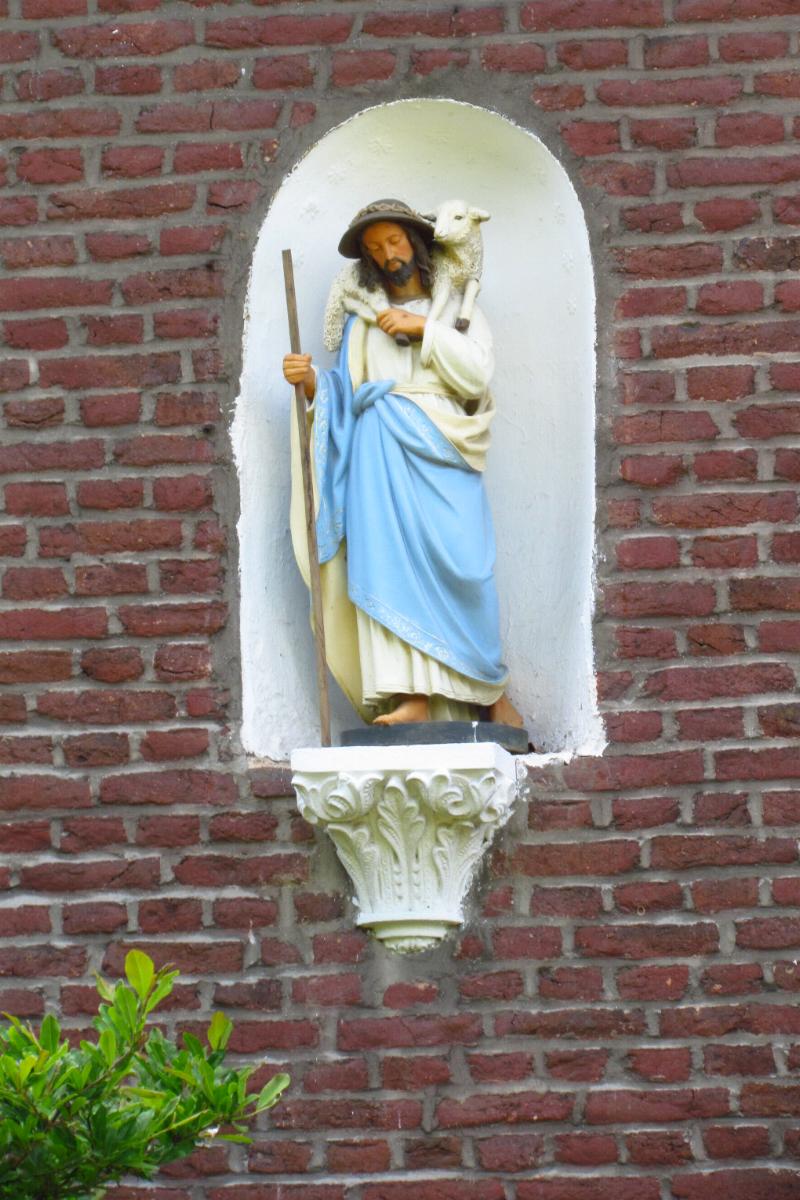 Standort: Der Gute Hirte hat seinen Standort als Wandfigur in der Außenwand des Pfarrhauses an der Josef - Loogen - Straße 1, im Ortsteil Rath-Anhoven in der Stadt Wegberg. Das Pfarrhaus und die Figur stehen mit der Nr. 76 in der Denkmalliste der Stadt Wegberg unter Denkmalschutz. * Denkmal Nr. 76 in der Denkmalliste der Stadt Wegberg