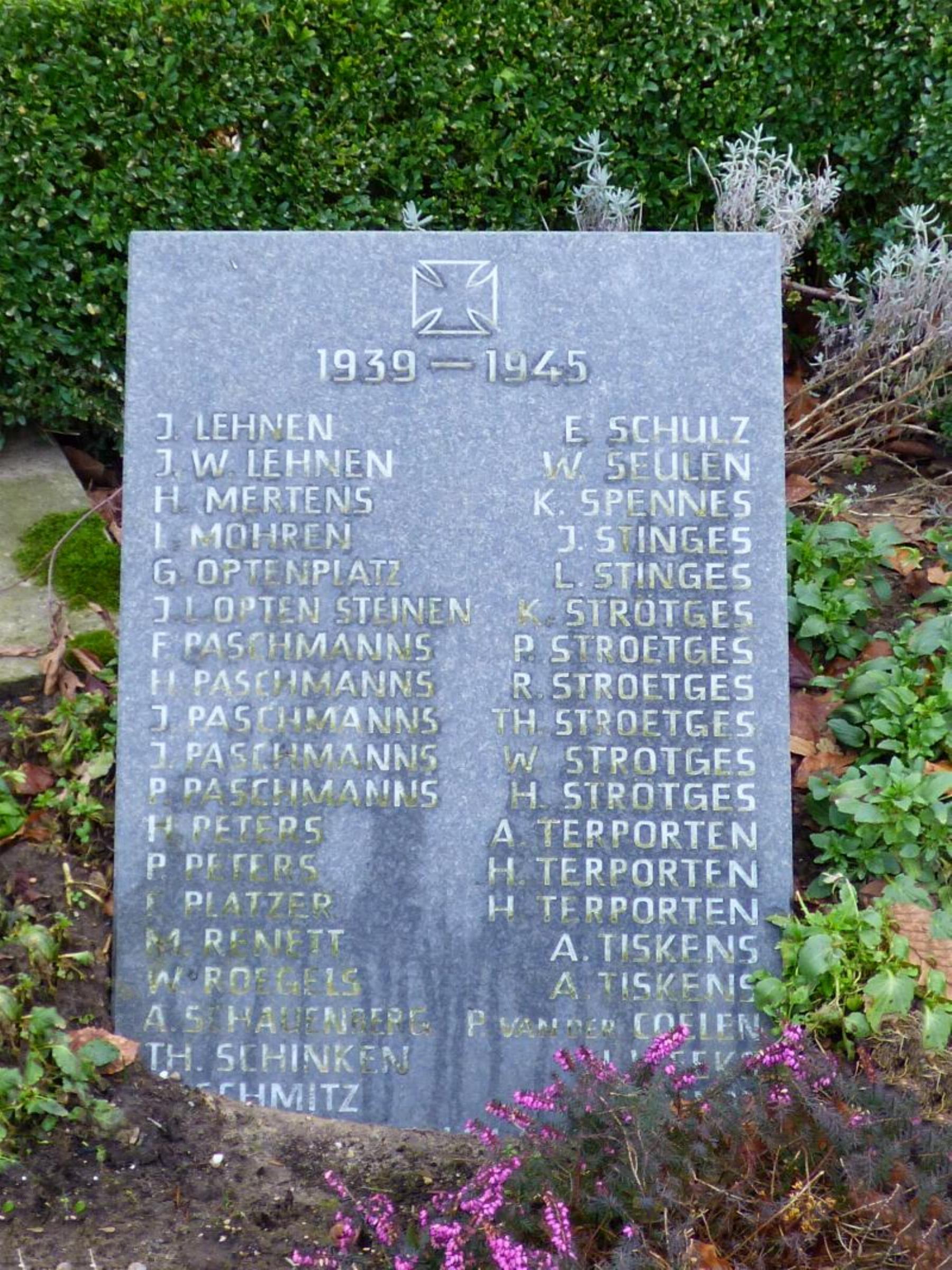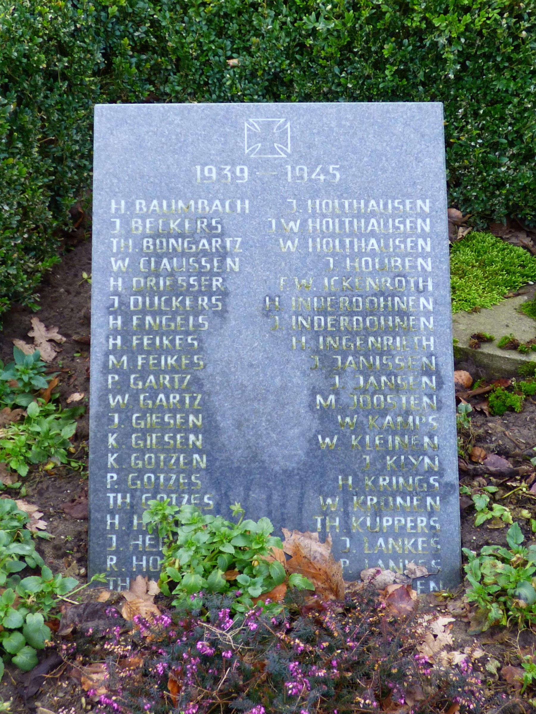 Standort: Das Ehrenmal hat seinen Standort an der Kirche in Born. Es steht mit der Nr. 21 in der Denkmalliste der Gemeinde Brüggen unter Denkmalschutz. Denkmalbeschreibung: D as Ehrenmal besteht aus Muschelkalk mit einem Bronzerelief. Auf zwei Steintafeln stehen die Namen der gefallenen Soldaten. Der Stein trägt die Inschrift:Den Toten zum Gedenken, den Lebenden zur Mahnung Das Ehrenmal ist ein wichtiges Zeugnis für die Geschichte des Ortes Born Erhaltung und Nutzung liegen aus ortsgeschichtlichen Gründen im öffentlichen Interesse.Quellenhinweis: * Dritte Ausgabe 1994: Handbuch des Bistums Aachen ISBN 3-87448-172-7 * Beschreibung der Denkmalbehörde