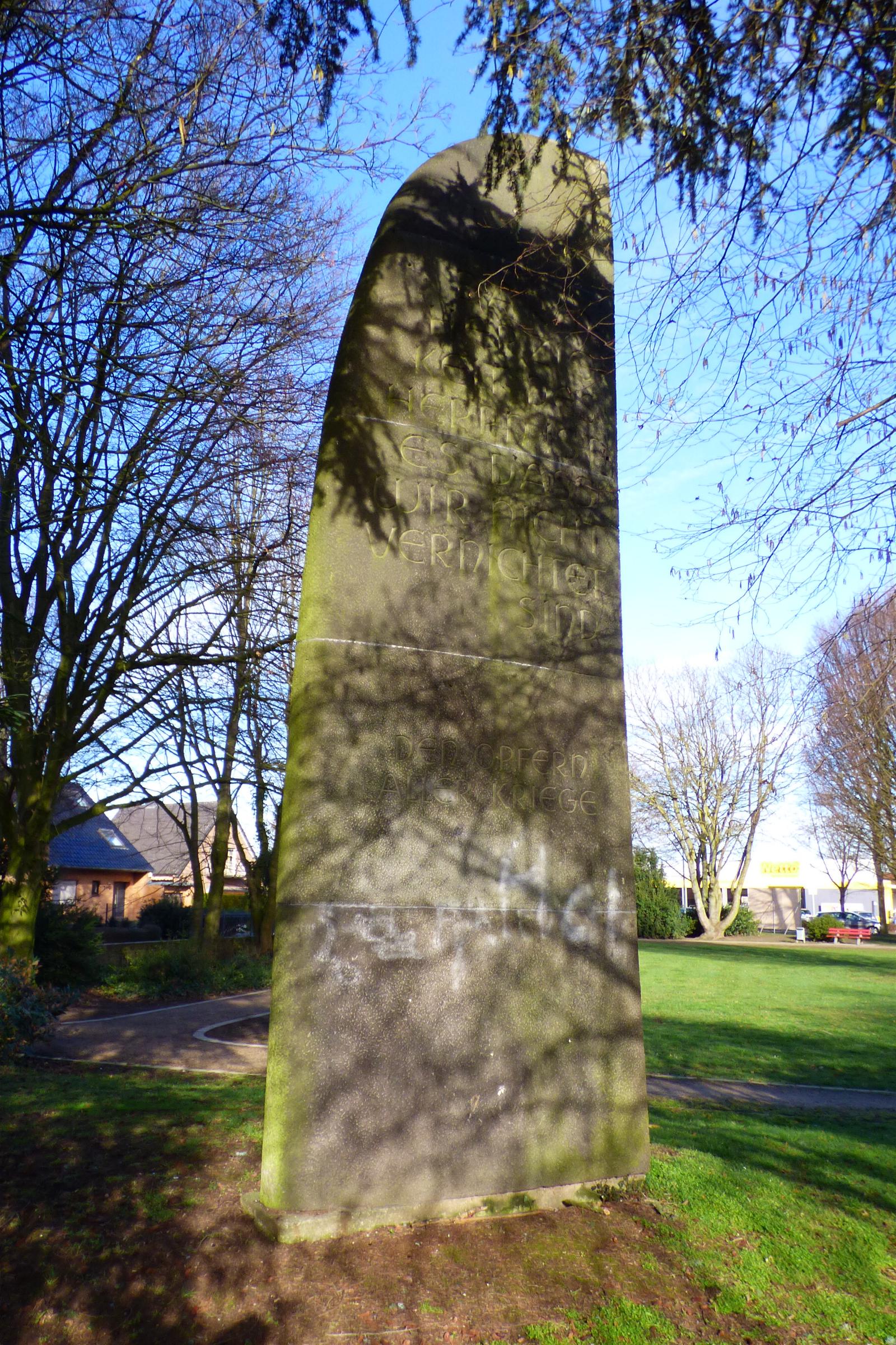 Standort: Das Ehrenmal hat seinen Standort auf dem alten Friedhof an der Kahrstraße / Breyeller Straße in Bracht. Beschreibung: D as Ehrenmal besteht aus einer ca. 4,00 m hohen Steinsäule. Der Stein trägt die Inschrift:DURCH DEINE BARMHERZIGKEIT OH HERR IST ES, DASS WIR NICHT VERNICHTET SIND DEN OPFERN ALLER KRIEGE Das Ehrenmal ist ein wichtiges Zeugnis für die Geschichte des Ortes Bracht. Erhaltung und Nutzung liegen aus ortsgeschichtlichen Gründen im öffentlichen Interesse.Infos zum Friedhof in Bracht: Der alte Friedhof hatte seinen Standort zwischen der Breyeller Straße, Kahrstraße, Nordwall und Ostwall. Er wurde im November 1855 durch den Dechant Crins aus Lobberich eingeweiht. 1936 wurde ein neuer Friedhof an der Breyeller Straße angelegt. 1965 wurde der alte Friedhof eingeebnet und zum Park umgestaltet. Das Ehrenmal, das Friedhofskreuz, einige Kreuzwegstationen eine Grabsäule und ein Grabkreuz sind bis heute erhalten geblieben. * Neue Friedhöfe außerhalb der Wälle angelegt R.P. Viersen v. 05.03.2014