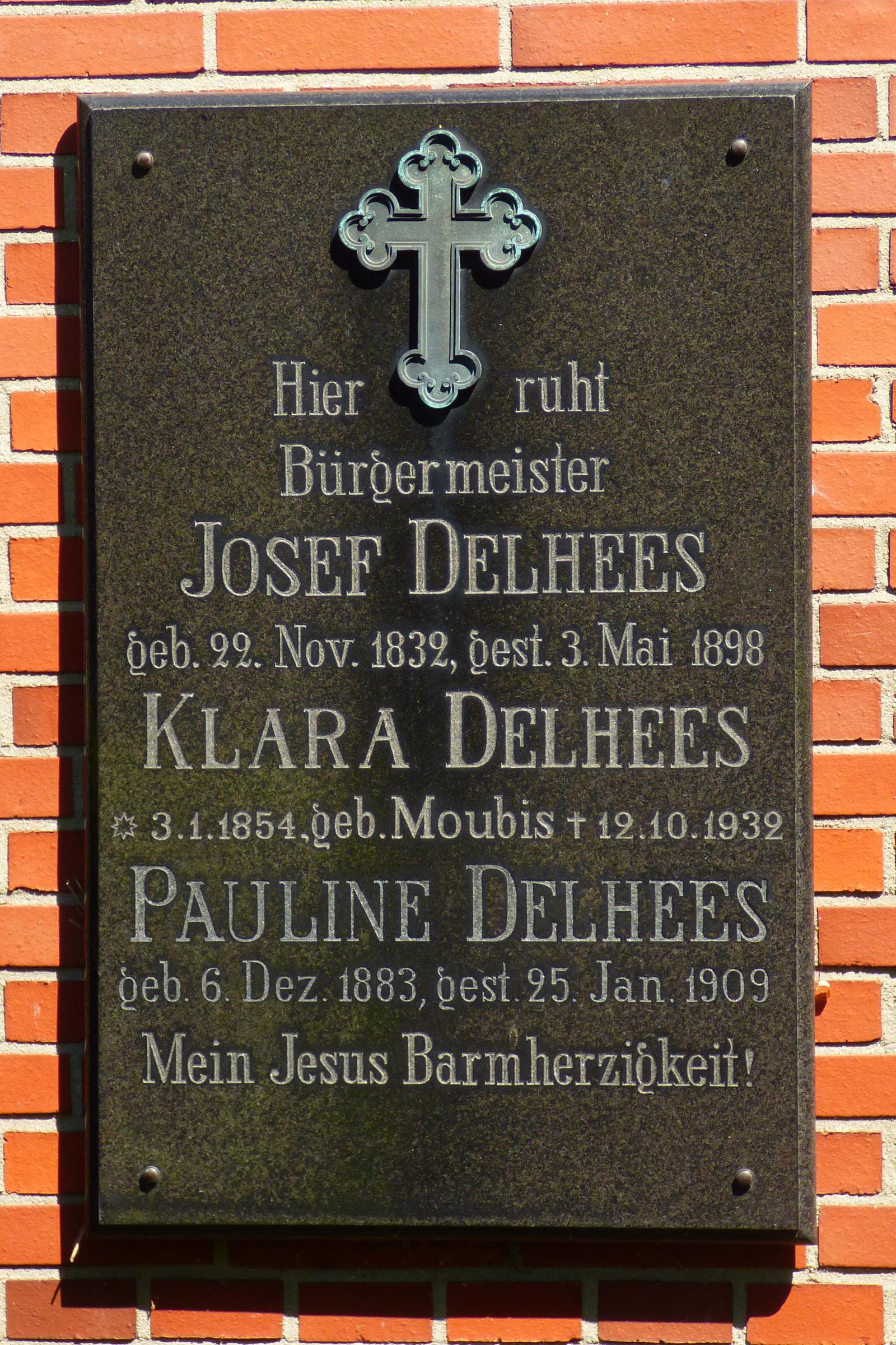 Standort: Die Bürgermeister Gedenkplatte hat ihren Standort an der Friedhofshalle auf der Friedhofanlage Am Kastell im Stadteil Breyell. Kurzbeschreibung Die Bürgermeister Gedenkplatte des Bürgermeisters Josef Delhees erinnert an das Leben und an Familienmitglieder der Familie Delhees. Quellenhinweis: * Dritte Ausgabe 1994: Handbuch des Bistums Aachen ISBN 3-87448-172-7 * Friedhofsbeschreibung der Stadt Nettetal