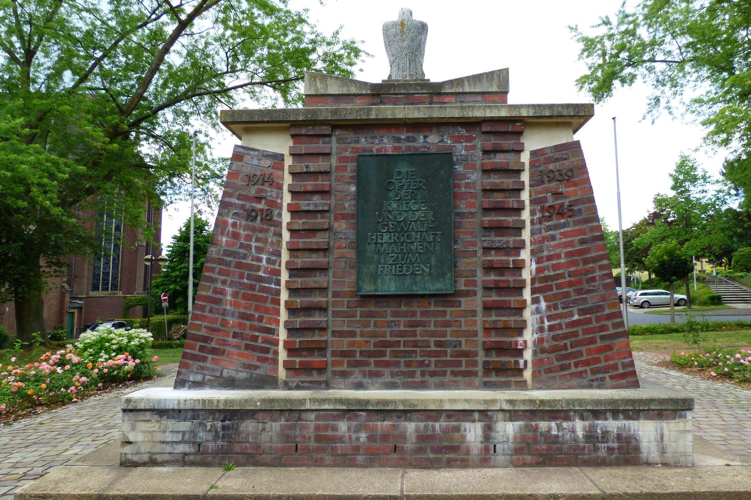 Tafeltext: Die Opfer der Kriege und der Gewaltherrschaft Mahnen zum Frieden 1914 - 1918 1939 - 1045 Standort: Das Ehrenmal hat seinen Standort im Friedenspark im Stadteil Hinsbeck.. Der Friedenspark liegt am Ortskern in der Nähe der Kirche. Beschreibung: Das Ehrenmal erinnert an die Kriegstoten der Weltkriege. Das Ehrenmal ist ein wichtiges Zeugnis für die Geschichte des Ortes Hinsbeck. Erhaltung und Nutzung liegen aus ortsgeschichtlichen Gründen im öffentlichen Interesse. Er soll den Lebenden zu Mahnung und den Verstorbenen zur Ehre dienen.Quellenhinweis: * Gefallenendenkmal in Hinsbeck