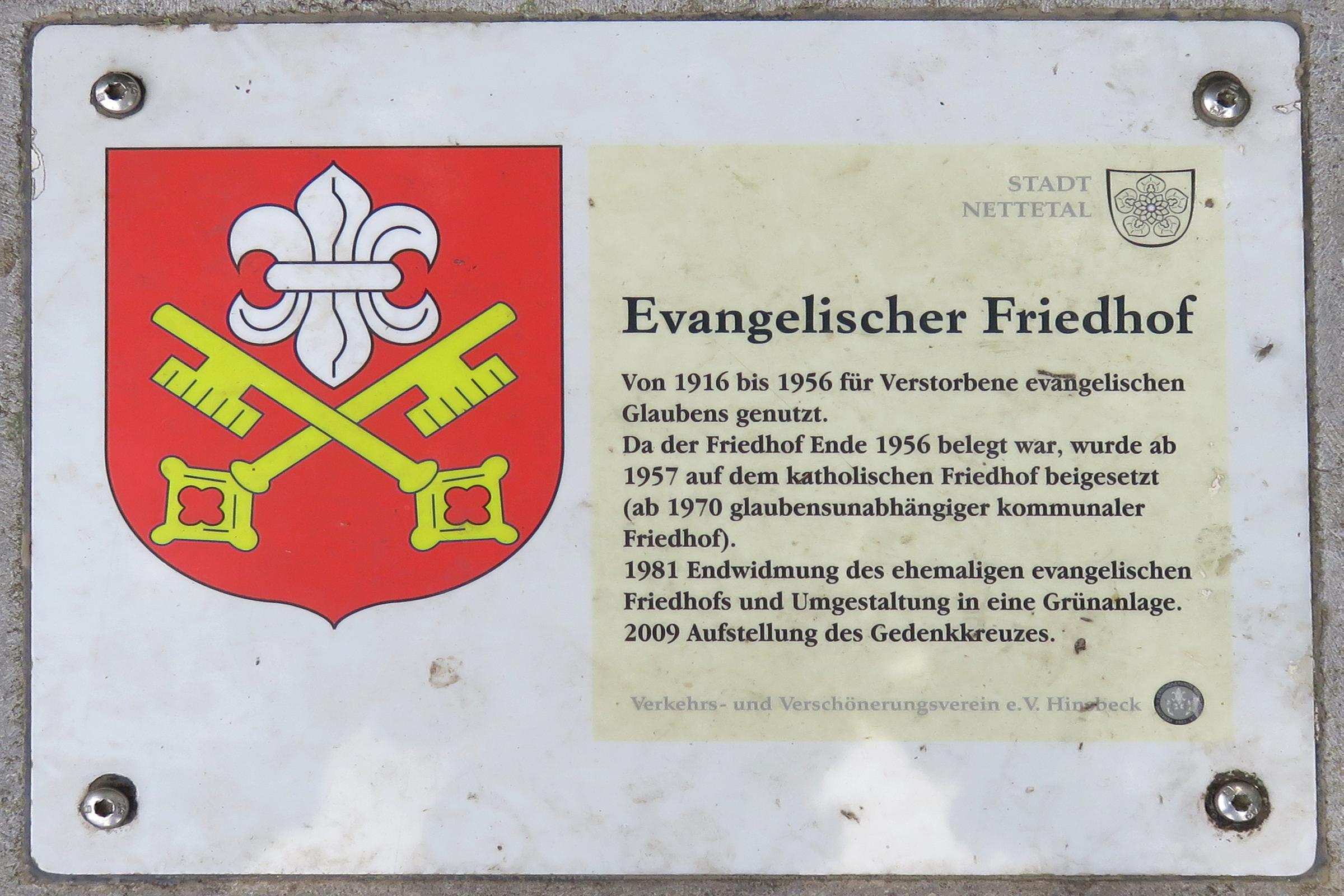 Standort: Das Gedenkkreuz hat seinen Standort auf dem alten evang. Friedhof an der Oirlicher Straße, im Stadtteil Nettetal - Hinsbeck. Beschreibung: Von 1916 bis 1956 für Verstorbene evangelischen Glaubens genutzt. Da der Friedhof Ende 1956 belegt war, wurde ab 1957 auf dem katholischen Friedhof beigesetzt (ab 1970 glaubensunbahängiger kommunaler Friedhof). 1981 Endwidmung des ehemaligen evangelischen Friedhofs und Umgestaltung in eine Grünanlage. 2009 Aufstellung des Gedenkkreuzes. Quellenhinweis: * Verkehrs- und Verschönerungsverein e.V. Hinsbeck