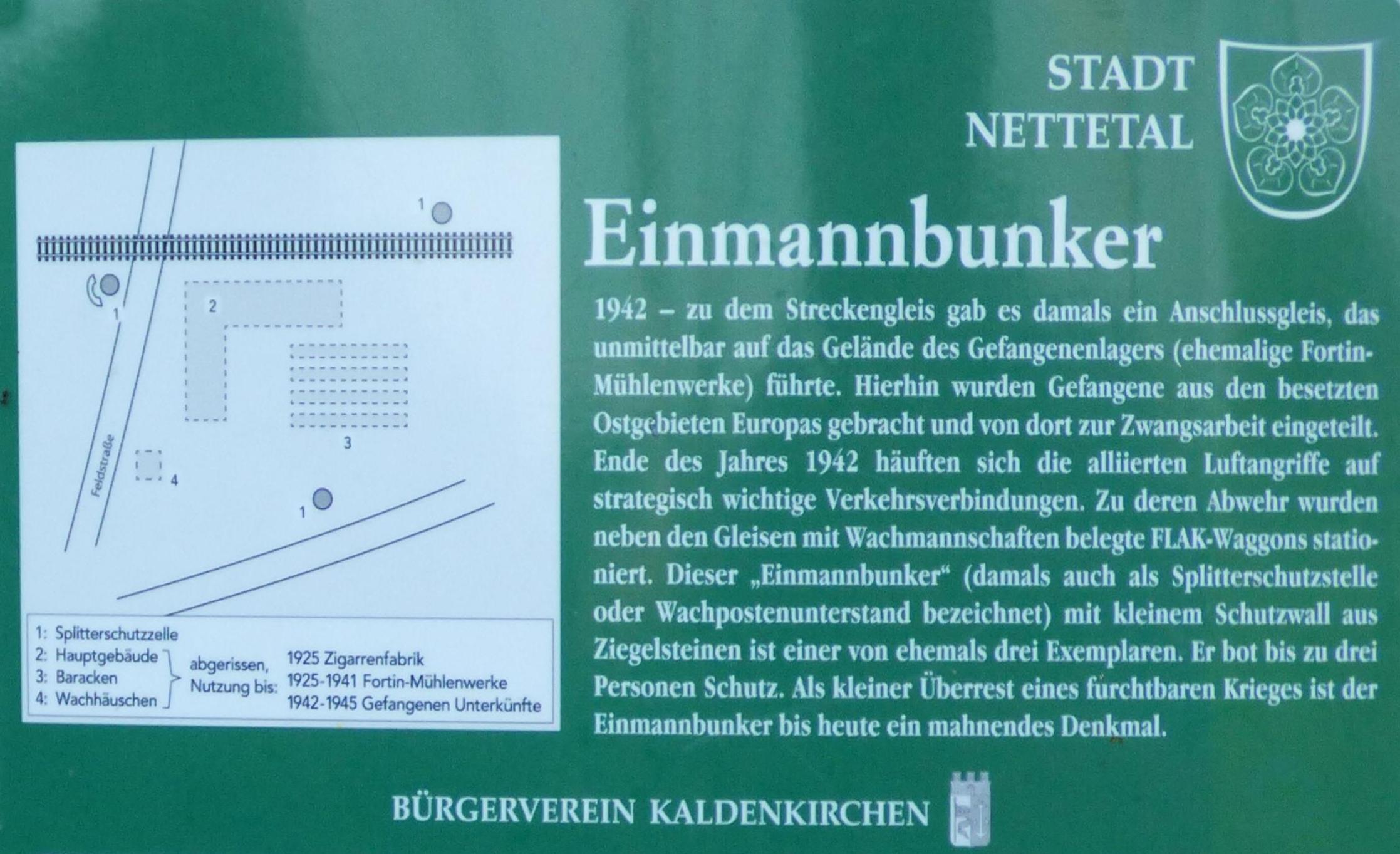Standort: Die Splitterschutzzelle befindet sich an der Feldstraße am Bahnübergang in Stadtteil Kaldenkirchen. Die Splitterschutzzelle sollte den Menschen ein mahnendes Denkmal bleiben. Quellenhinweis: Infoschild Bürgerverein Kaldenkirchen