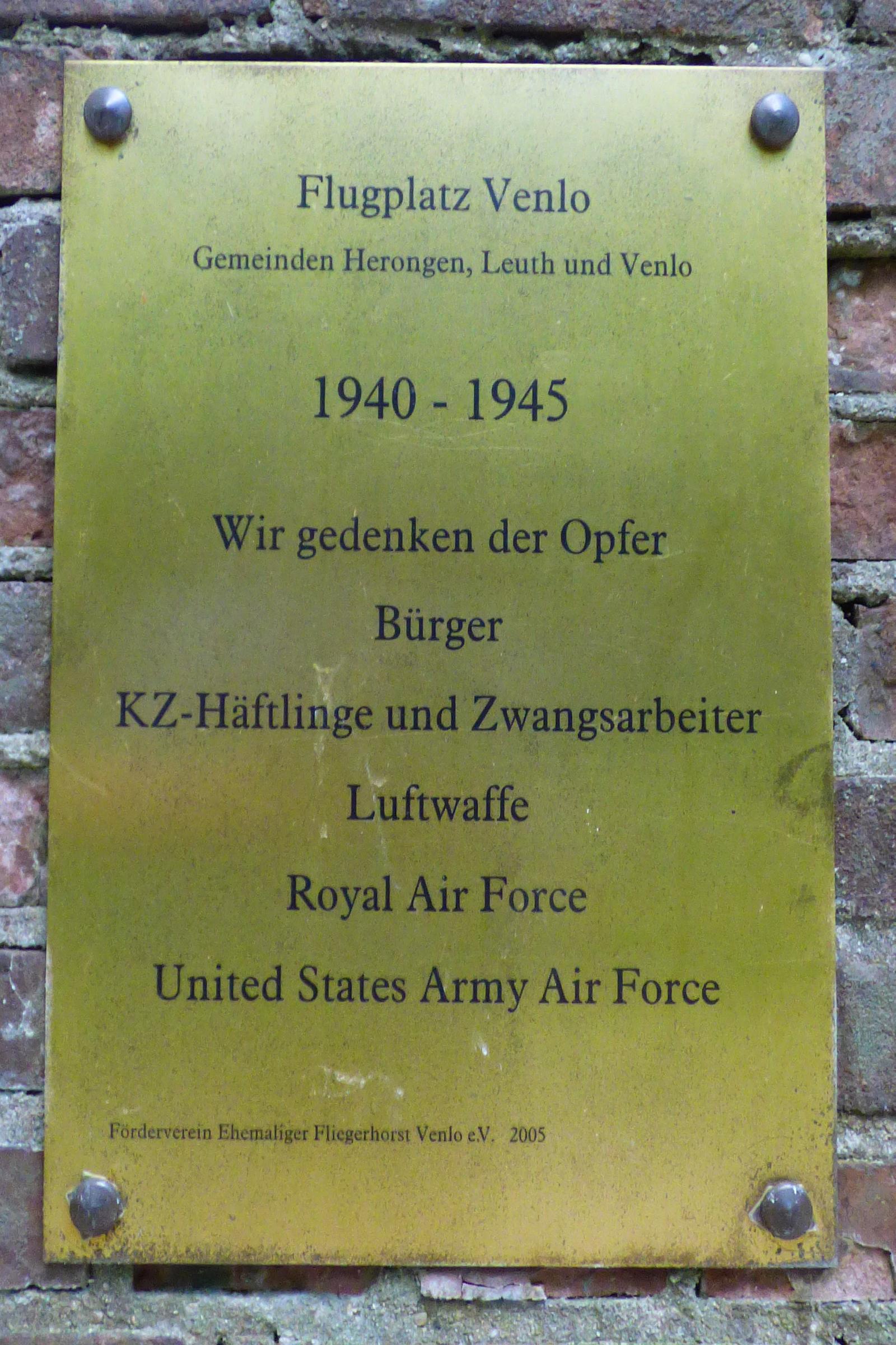 Standort und Beschreibung: Der Gedenkstein befindet sich in der Leuther Heide etwa 200 m hinter der Einfahrt von Tor 9. Er soll das Gedenken an die zahlreichen Opfer des Krieges hochhalten. Er ist ein wichtiges Zeugnis für die Geschichte der Gemeinden Herongen, Leuth und Venlo. Erhaltung und Nutzung liegen aus ortsgeschichtlichen Gründen im öffentlichen Interesse und sollen den Lebenden zu Mahnung und den Verstorbenen zur Ehre dienen.