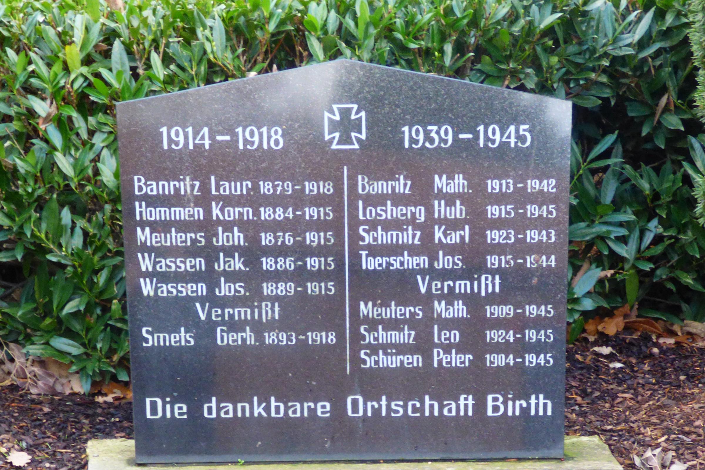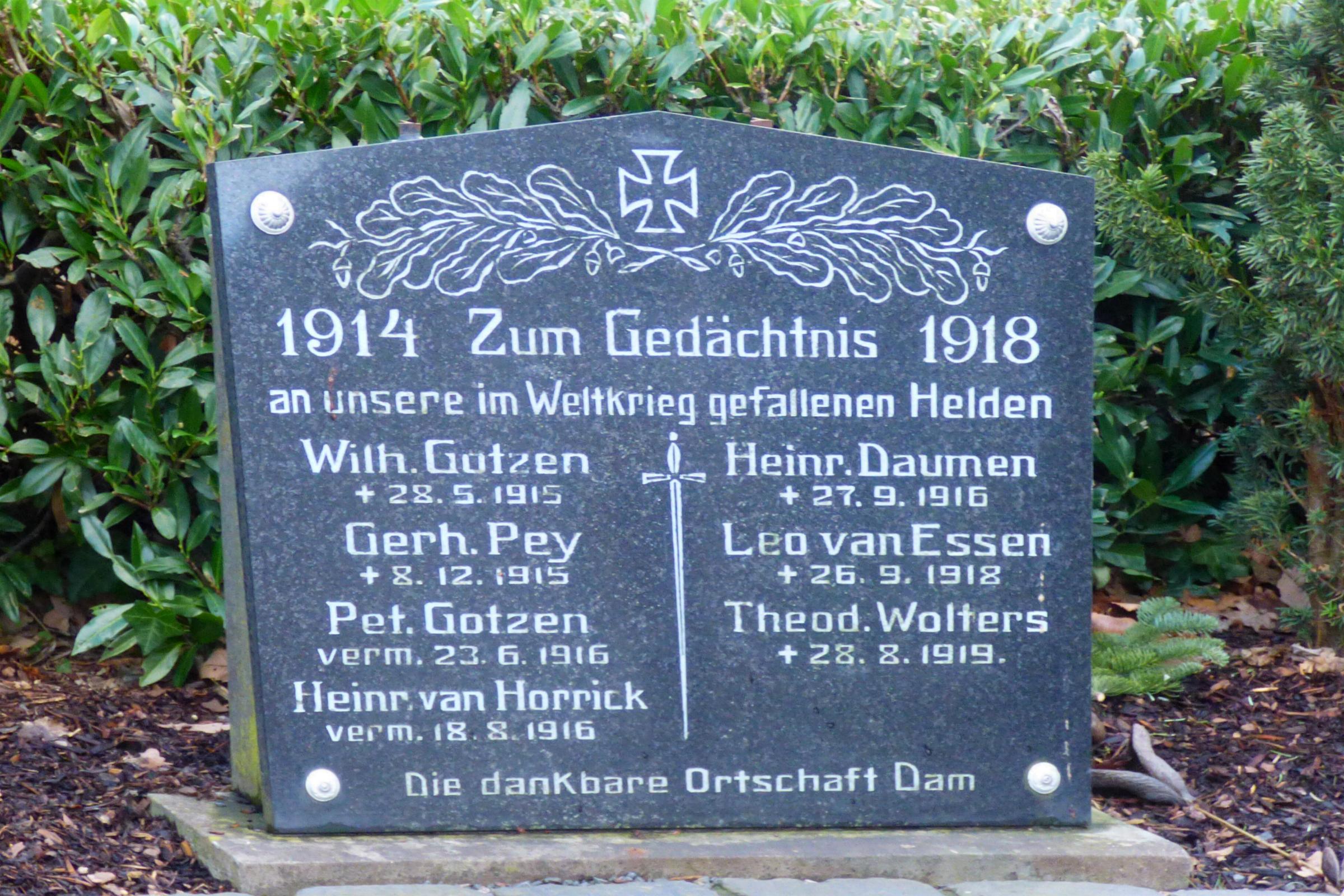 Standort: Das Ehrenmal hat seinen Standort in Dam 77 / Wilhelm - Brester - Straße. Das Wegekreuz von 1876 ist Bestandteil des Ehrenmals. Beschreibung: Bei dem Ehrenmal handelt es sich um ein ca. 3,00 m hohes Steinkreuz mit einem Korpus und drei Steintafeln mit den Namen der gefallenen und vermissten Soldaten von Birth und Dam. Das Ehrenmal soll den Lebenden zur Mahnung und den Verstorbenen zur Ehre dienen. Das Ehrenmal ist bedeutend für die Gemeinde Niederkrüchten und den Ort Dam. An der Erhaltung und Nutzung besteht aus ortsgeschichtlichen Gründen ein öffentliches Interesse.