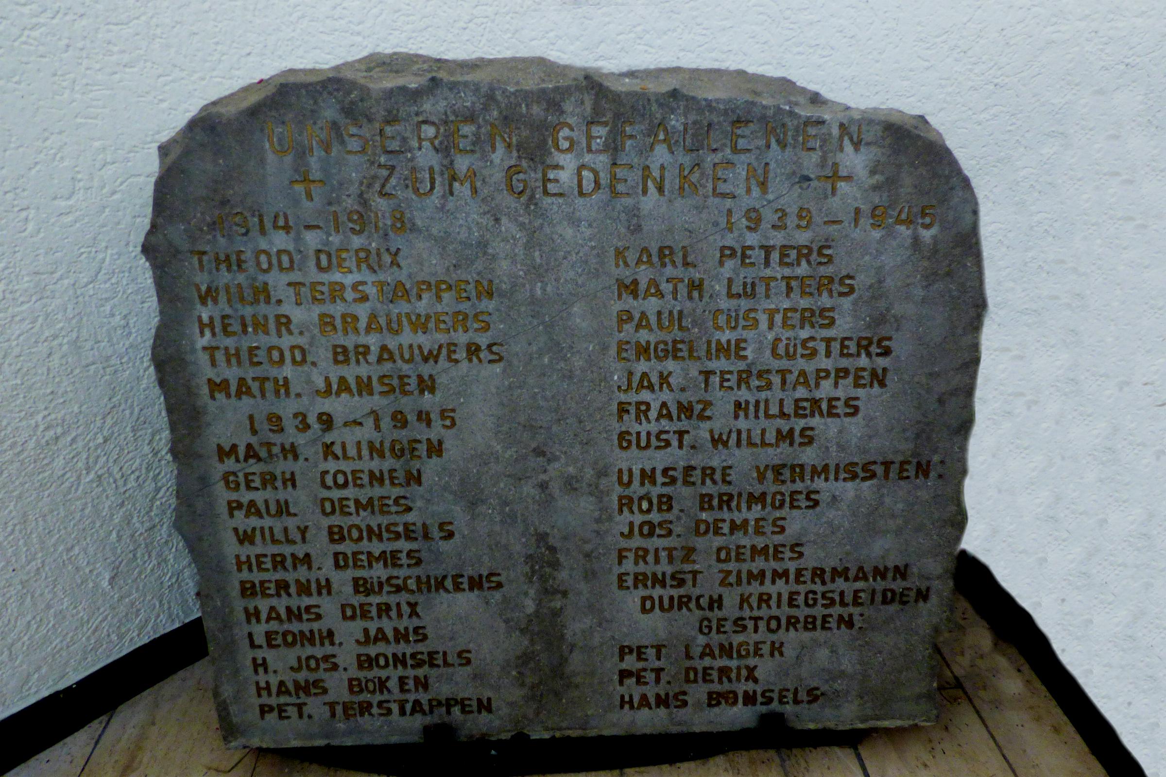 Standort: Der Gedenkstein hat seinen Standort in der Lucia Kapelle im Ortsteil Laar. Beschreibung: Bei dem Gedenkstein handelt es sich um einen ca. 0,80 m x 1,00m großen Naturstein, mit den Namen der in den Weltkriegen gefallenen und vermißten Soldaten der Ortschaft Laar. Er soll den Lebenden zur Mahnung und den Verstorbenen zum Ehre dienen.
