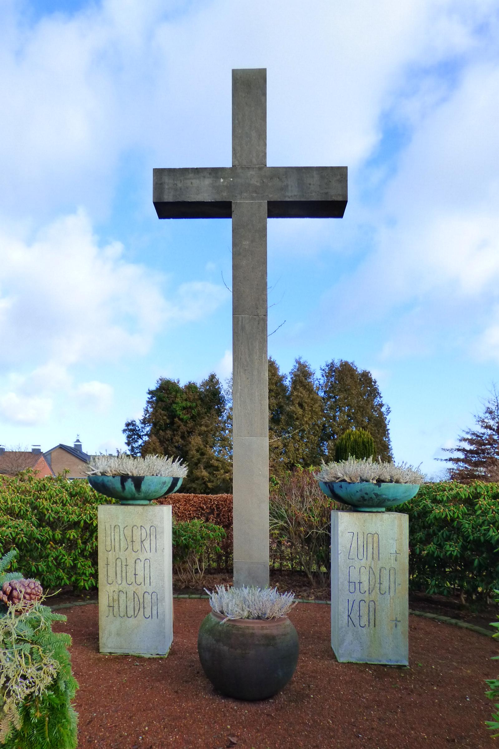 Bei dem Ehrenmal handelt es sich um ein ca. 5,00 m hohes schlichtes Kreuz mit zwei Steinsäulen und Pflanzenschmuck. Eine Hecke gibt dem Ehrenmal eine besondere Betonung. In einer Blickachse aufgestellt ist das Kreuz ein wichtiger Punkt für die Gestaltung des Friedhofs. Die Steinsäulen tragen die Inschrift: