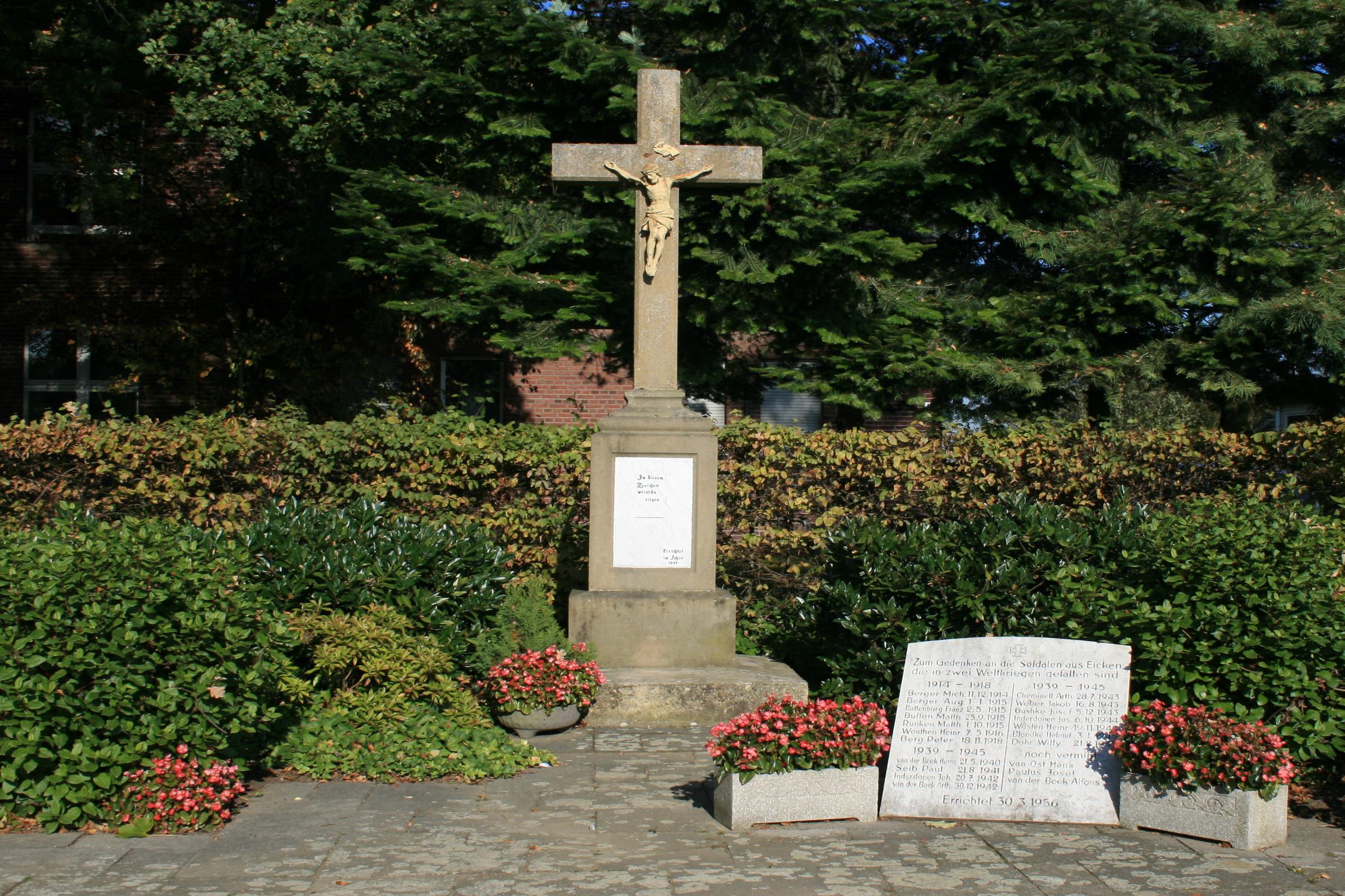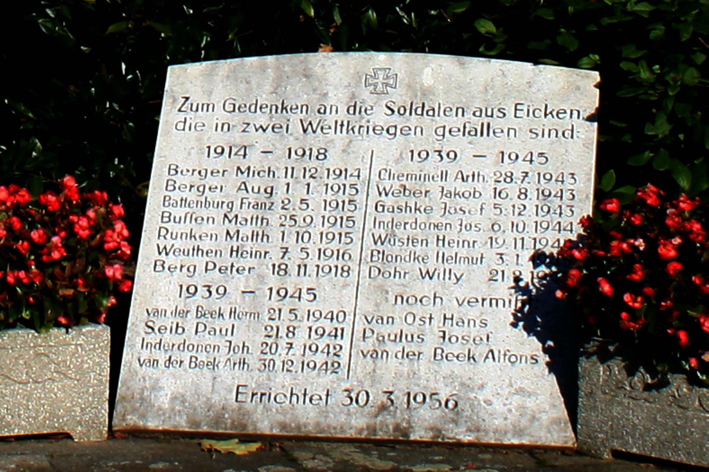 Standort: Das Ehrenmal hat seinen Standort an der Dorfstraße in Eicken 17. Das Ehrenmal mit dem Wegekreuz steht mit der Nr. 4 in der Denkmalliste Schwalmtal unter Denkmalschutz. Denkmalbeschreibung: Das Ehrenmal zeigt sich als beschriftete Steinplatte mit den Namen der gefallenen und vermißten Soldaten 1914 - 1918 und 1939 - 1945. Sie wurde am 30. März 1956 errichtet. Das Ehrenmal ist ein wichtiges Zeugnis für den Ort Eicken. Erhaltung und Nutzung liegen aus ortsgeschichtlichen Gründen im öffentlichen Interesse. Das Ehrenmal soll den Lebenden zur Mahnung und den Verstorbenen zur Ehre dienen. Quellenhinweis: * Denkmal Nr. 4 Denkmalliste Schwalmtal * Dritte Ausgabe 1994: Handbuch des Bistums Aachen ISBN 3-87448-172-7