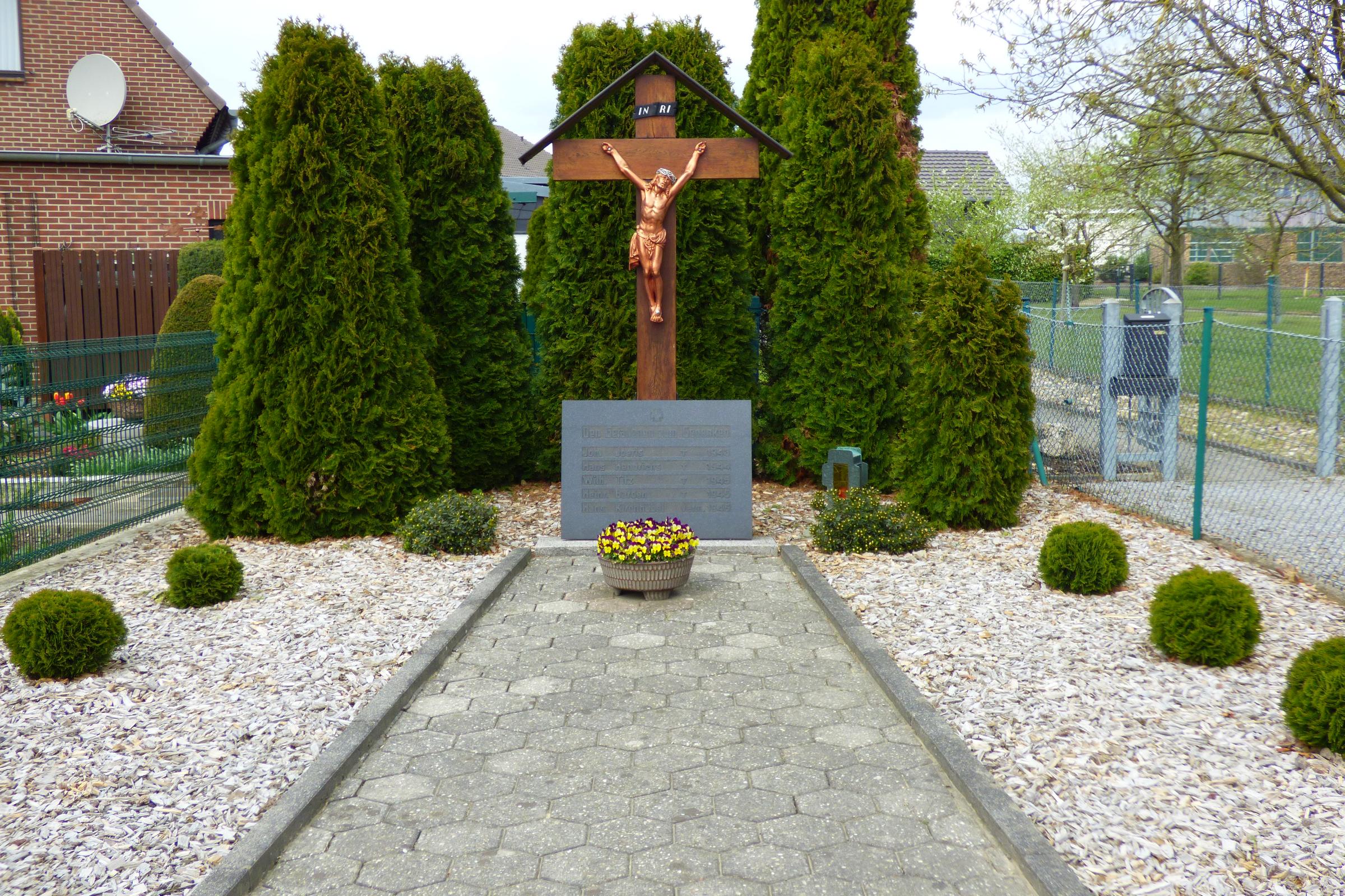 Standort: Das Ehrenmal mit dem Wegekreuz hat seinen Standort in Eschenrath 2. Beschreibung: Das Ehrenmal zeigt sich als beschriftete Steinplatte mit den Namen der gefallenen und vermißten Soldaten des zweiten Weltkrieges. Das Ehrenmal ist ein wichtiges Zeugnis für den Ort Eschenrath. Erhaltung und Nutzung liegen aus ortsgeschichtlichen Gründen im öffentlichen Interesse. Das Ehrenmal soll den Lebenden zur Mahnung und den Verstorbenen zur Ehre dienen. Quellenhinweis: * Dritte Ausgabe 1994: Handbuch des Bistums Aachen ISBN 3-87448-172-7