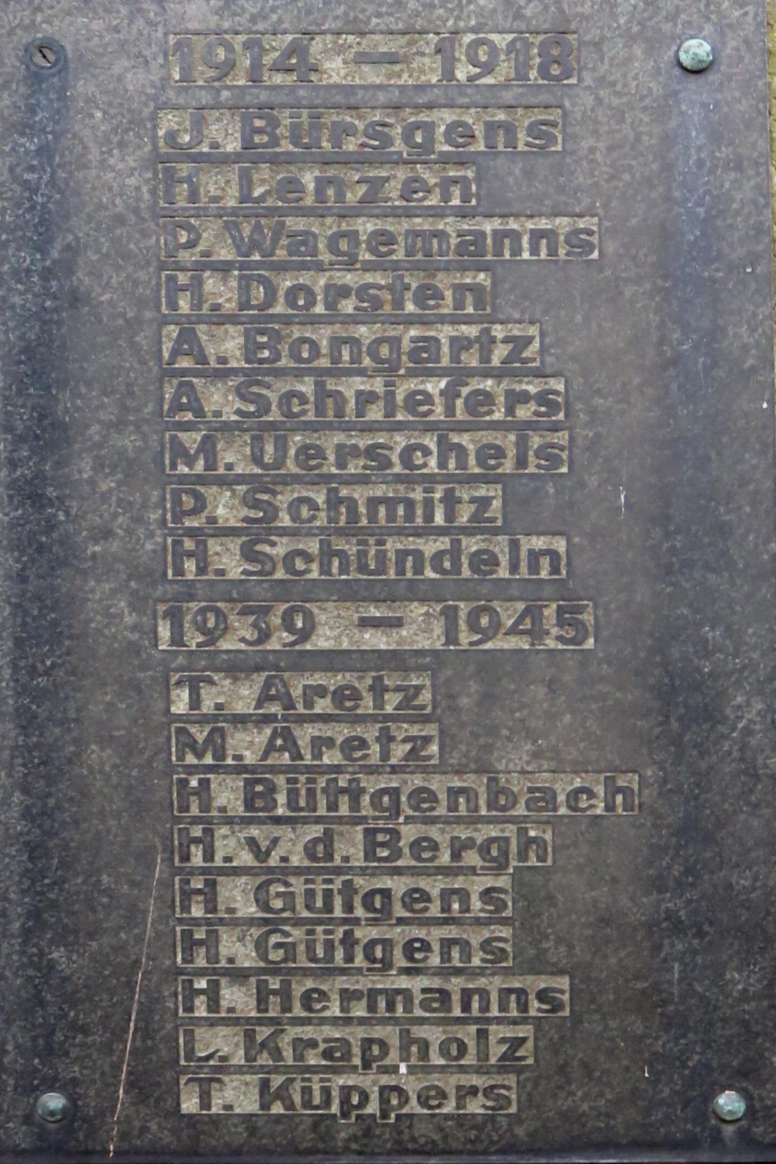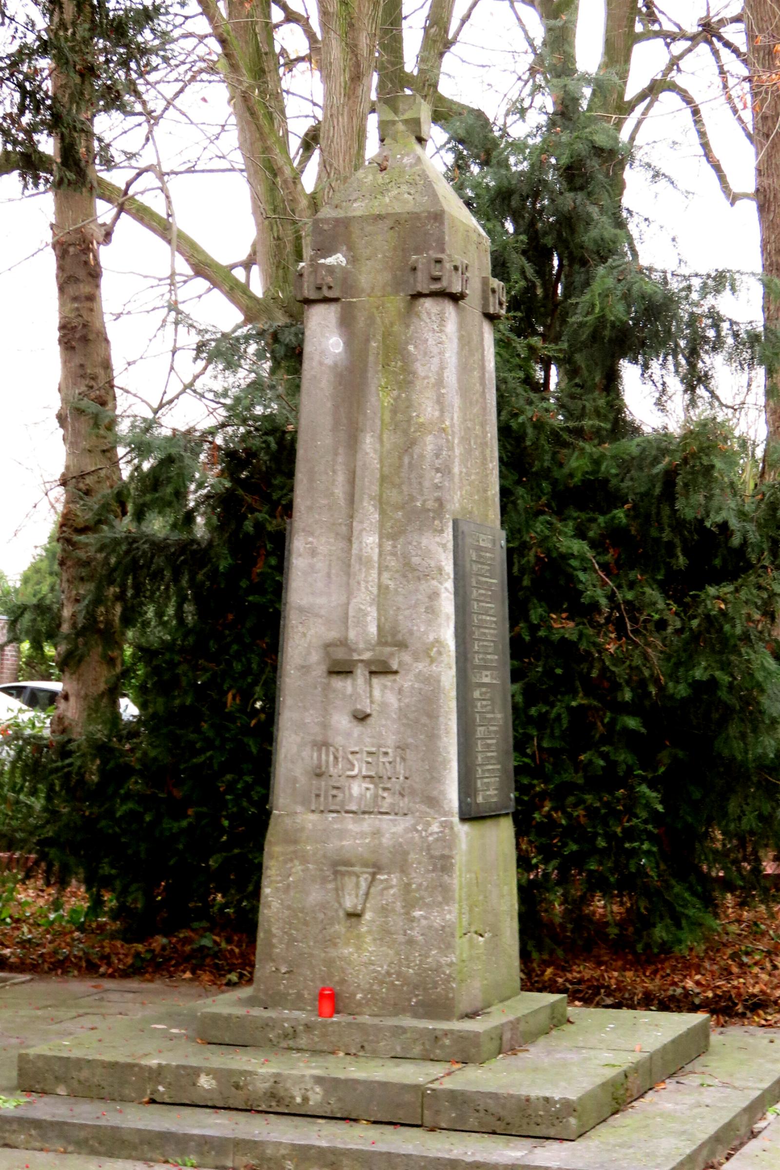 die Denkmalsweihe statt. Beschreibung: Auf einer dreistufigen Sockelplatte erhebt sich in einer kleinen, durch eine Hecke eingefassten Grünanlage ein ca. 3,30 m hoher Obelisk aus Muschelkalk. Dieser freistehende, sich nach oben verjüngende Steinpfeiler trägt auf seiner pyramidenförmigen Spitze ein nach allen Seiten ausgerichtetes gleichschenkeliges Kreuz, einem „eisernen Kreuz“ gestalterisch angelehnt. Die äußeren, scharierten Kanten des Obelisken sind nach oben hin verjüngend abgeschrägt und werden unterhalb der pyramidenförmigen Spitze durch aufgesetzte Tafeln an den Ecken begrenzt. Darauf befinden sich in erhabener Schrift umlaufend die übereck geführten Jahreszahlen des 1. Weltkriegs: 19 14 / 19 18. Darunter ist vorderseitig ein aufrechtes Schwert ausgearbeitet. Dieses Kennzeichen des Kriegers, speziell des Ritters, steht für seine Tat- und Kampfkraft bzw. seinen Verteidigermut und unterstreicht aufrecht stehend seine Stärke. UNSERN HELDEN Bemerkenswert ist als durchgängiges Element des Schwertes, der Buchstaben und Zahlen sowie des bekrönenden Kreuzes, alle wie der Obelisk aus Muschelkalk gearbeitet, die „prismaartige“ Gestaltung, angelehnt an die expressionistische Kunst der 1920er Jahre. Seitlich und rückwärtig sind Namenstafeln aus schwarzem Granit (Impala) angebracht. Diese sind nachträglich nach 1945 gefertigt worden, da auf allen sowohl die Namen der Gefallenen des Ersten und Zweiten Weltkriegs aus der Sektion aufgeführt werden. Der Entwurf stammt von dem Düsseldorfer Bildhauer Henry W. Dietrich. Eine überregionale Bedeutung kommt im nicht zu Teil. In Mönchengladbach-Hehn wurde 1926 neben der Pfarrkirche St. Mariä Heimsuchung ebenfalls ein Ehrenmal für die Gefallenen des 1. Weltkriegs nach seinem Entwurf errichtet. Ein Denkmal für die Gefallenen des 10. Januars (Spartakisten-Unruhen) in Düsseldorf, das Dietrich dem Bürgermeister 1919 anbietet, kam nicht zur Ausführung. Der Obelisk, altägyptische Ursprünge aufweisend und als Herrschaftszeichen und Symbols ewigen Lebens stehend, verbreitet sich in der 2. Hälfte des 18. Jahrhunderts als Nationaldenkmal in Deutschland. Zu Ende des 19. Jahrhunderts zählte es neben dem Grabpfeiler und der Grabstele zu den beliebtesten Kriegerdenkmalformen. Diese Entwicklung wurde unterstützt durch die „Beratungsstelle für die Kriegerehrung“ in Berlin, die Leitsätze für Errichtung von Denkmälern vorgab. Kriegerdenkmale, die nicht nur an Feldherren oder Offiziere erinnern, sondern auch an einfache Soldaten, entstanden erst in der Neuzeit (Französische Revolution). Nach Einführung der allgemeinen Wehrpflicht war die breite Masse der Bevölkerung vom Krieg betroffen. Das Wehrpflichtsystem begünstigte eine rücksichtslose Kriegführung mit riesigen Verlusten durch die Mobilisierung einer bislang unvorstellbaren Zahl von Soldaten. Die erstmalige Erwähnung der Namen einfacher Soldaten auf Gedenktafeln und Denkmälern sollte die Angehörigen trösten, indem es dem Tod ihrer Verwandten Sinn verlieh. Dieses spiegelt sich auch in der Ansprache des Dülkener Kaplans Plümpe bei der Einweihung des Kriegerdenkmals in Dülken-Busch wider: „Dieses Denkmal aus hartem Stein sollte aber stets eine Mahnung sein, im Geiste der Toten zu handeln. Es solle zur Treue mahnen, zur Pflichterfüllung, zum Opfersinne“. Das Kriegerdenkmal in Dülken-Busch ist, bei aller Distanz aus heutiger Sicht zum Inhalt, ein Beispiel für den Gemeinschaftssinn der Bürger einer Sektion. Das ausgeführte Monument, der Obelisk, entsprach dem „empfohlenen“ Zeitgeschmack und verzichtet auf christliche Motive. Aus wissenschaftlichen, insbesondere lokalhistorischen und kunstgeschichtlichen Gründen stehen Erhaltung und Nutzung des Kriegerdenkmals gemäß § 2 (l) Denkmalschutzgesetz im öffentlichen Interesse. Quellenhinweis: * Dritte Ausgabe 1994: Handbuch des Bistums Aachen ISBN 3-87448-172-7 * Denkmal Nr. 465 der Stadt Viersen