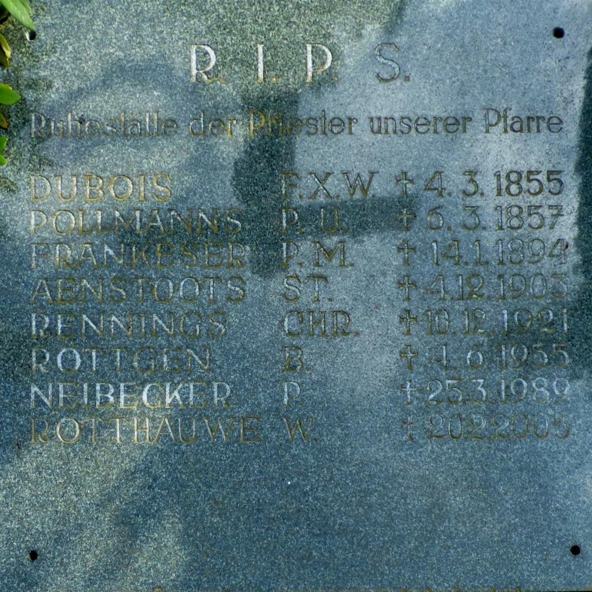 Standort: Das Hochkreuz und die Priestergräber befinden sich an der Herrenlandstraße in Brüggen. Auf einer großen Steinplatte stehen die Namen der verstorbenen Pfarrer von Brüggen. Die Gräber sind Bestandteil der Friedhofanlage.