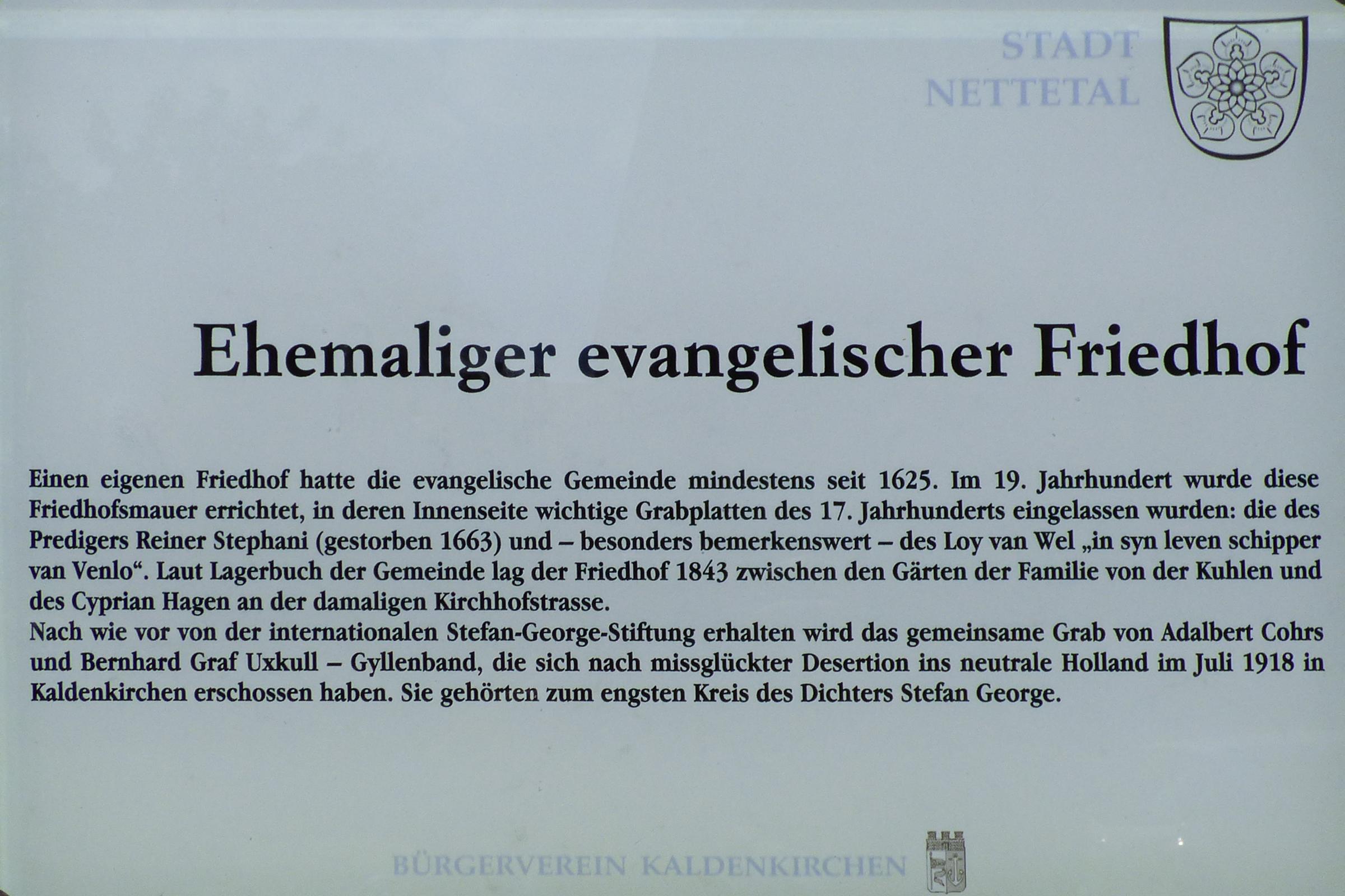 Standort: Der ehemalige evangelische Friedhof befindet sich an der Straße Zur Lärche im Stadtteil Kaldenkirchen. Kurzbeschreibung: Für Bestattungen wird er heute nicht mehr genutzt und nur noch wenige Bürger, deren Angehörige dort bereits bestattet lagen, hatten in der Vergangenheit noch Bestattungsrechte. Der Friedhof liegt sehr geschützt, von der Straße kaum erkennbar, hinter einer hohen efeubewachsenen Backsteinmauer, die den Blick ins Innere des Friedhofes verwehrt.Die Rückseite der Mauer schmücken alte Grabplatten. Eichenbäume, alter Efeu mit großen Insekten anlockenden Blütenständen und Rhododendron prägen das Bild. Alte Zwischenhecken blieben bislang stehen, so dass die frühere Lage der Grabfelder noch erkennbar ist. Mehr und mehr wandelt sich der Friedhof in eine Grünanlage. Er stellt gleichzeitig eine reizvolle innerörtliche Fußwegeverbindung dar. Quellenhinweis: * Dritte Ausgabe 1994: Handbuch des Bistums Aachen ISBN 3-87448-172-7 * Friedhofsbeschreibung der Stadt Nettetal