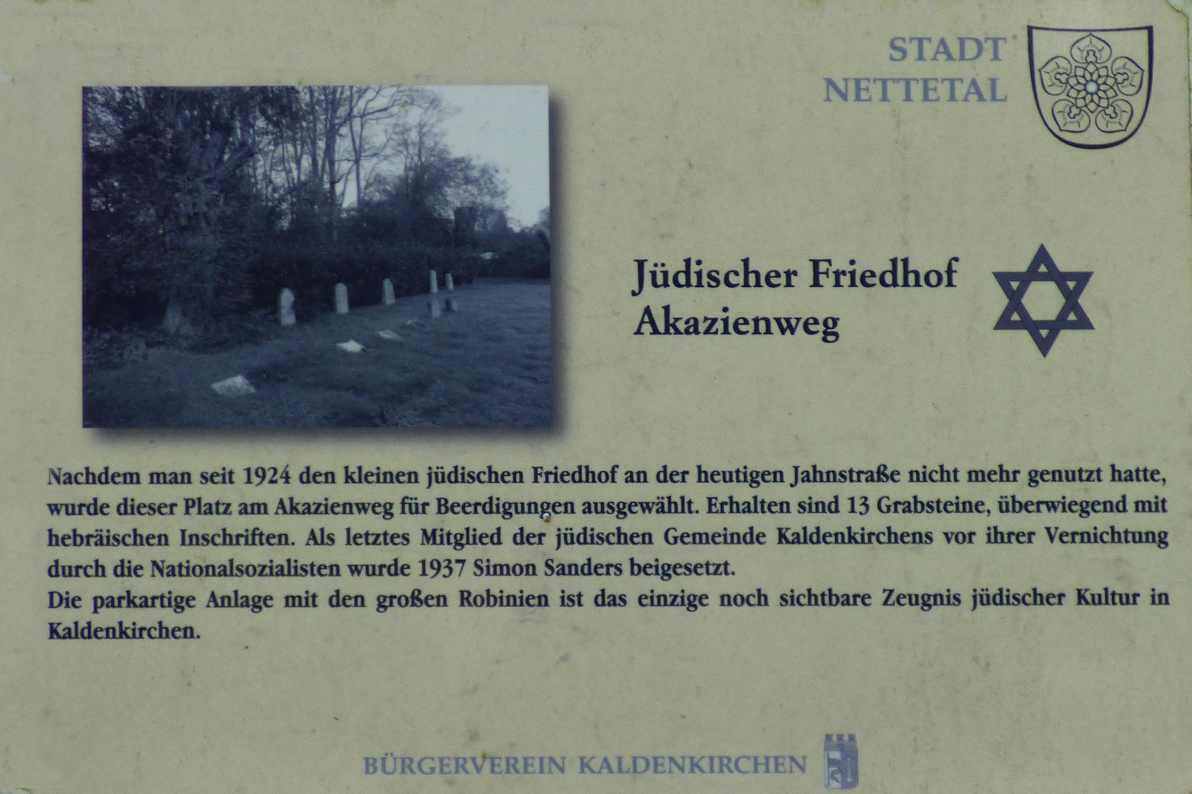 Standort: Der Jüdische Friedhof befindet sich am Akazienweg im Stadtteil Kaldenkirchen. Der Friedhof steht mit der Nr. 186 in der Denkmalliste Nettetal unter Denkmalschutz Kurzbeschreibung: Wer den Friedhof an seiner nördlichen Seite verlässt, gelangt zum jüdischen Friedhof am Akazienweg. Dieser Friedhof ist geschlossen, interessierte Bürger können bei Bedarf jedoch den Schlüssel bei der Stadtverwaltung, Bereich Grünflächen/Friedhöfe, ausleihen. Der jüdische Friedhof wird durch die alten Grabsteine und die mächtigen Akazien geprägt. Um die Pflege der Anlage kümmert sich die Stadt Nettetal im Auftrag des Eigentümers, der jüdischen Kultusgemeinde Düsseldorf. Ein weiterer jüdischer Friedhof befindet sich an der Jahnstraße. Denkmalbeschreibung: