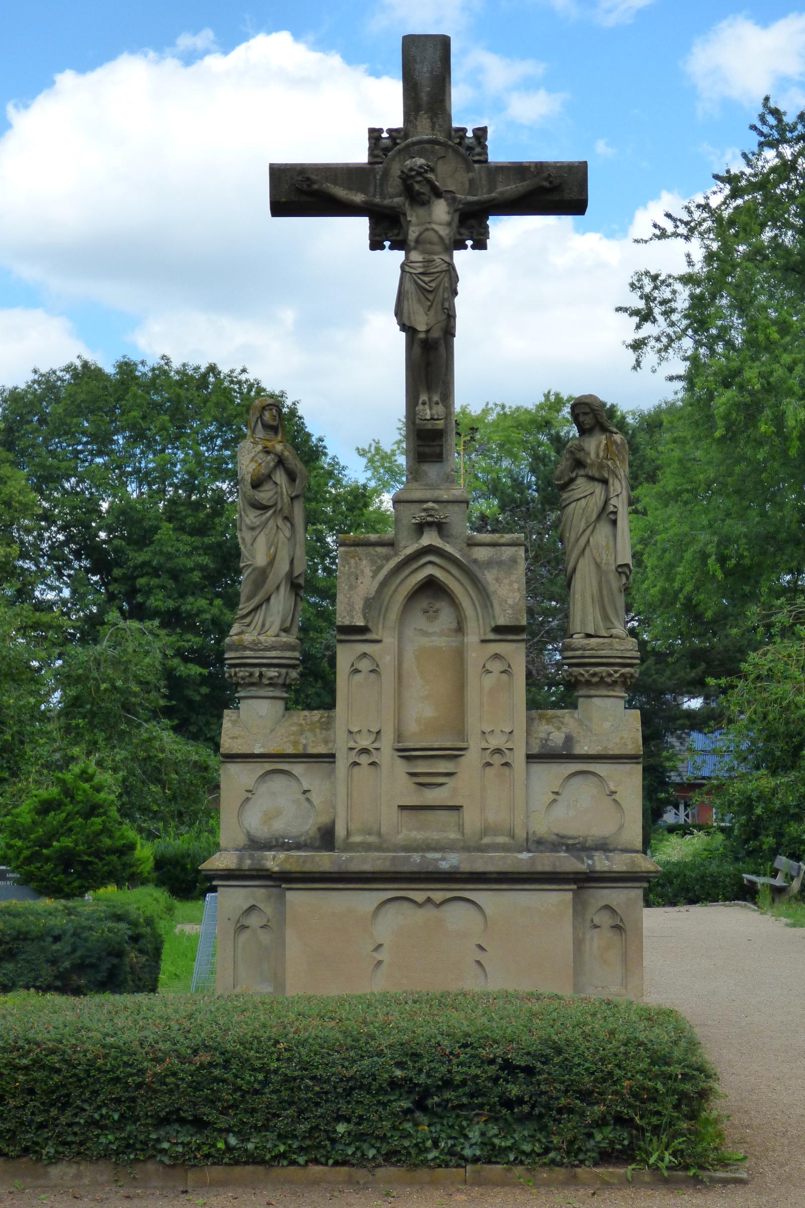 Standort: Das Friedhofskreuz befindet sich auf dem Friedhof am Hampoel im Stadtteil Leuth. Das Kreuz mit der Kreuzigungsgruppe bildet den Mittelpunkt des Friedhofs und ist Bestandteil der Anlage. Kurzbeschreibung: Den kleinen Friedhof in Leuth prägt die mächtige, mehrere hundert Jahre alte Blutbuche in seiner Mitte. Der Baum ist als Naturdenkmal eingetragen und wird sorgfältig gepflegt.Fast ebenso wichtig für das Friedhofsbild sind die Kreuzwegstationen und das Hochkreuz aus Sandstein, welches in der Hauptwegeachse steht. Die durch ihre Form und große Glasflächen modern wirkende Friedhofskapelle stammt aus dem Jahr 1970. Auch neuere Tendenzen in der Beerdigungskultur finden auf dem Friedhof in Leuth ihren Platz; so wurde in unmittelbarer Nähe zur Friedhofskapelle eine gelungene Anlage für Urnenbestattungen hergerichtet, die starken Zuspruch findet. Quellenhinweis: * Dritte Ausgabe 1994: Handbuch des Bistums Aachen ISBN 3-87448-172-7 * Friedhofsbeschreibung der Stadt Nettetal