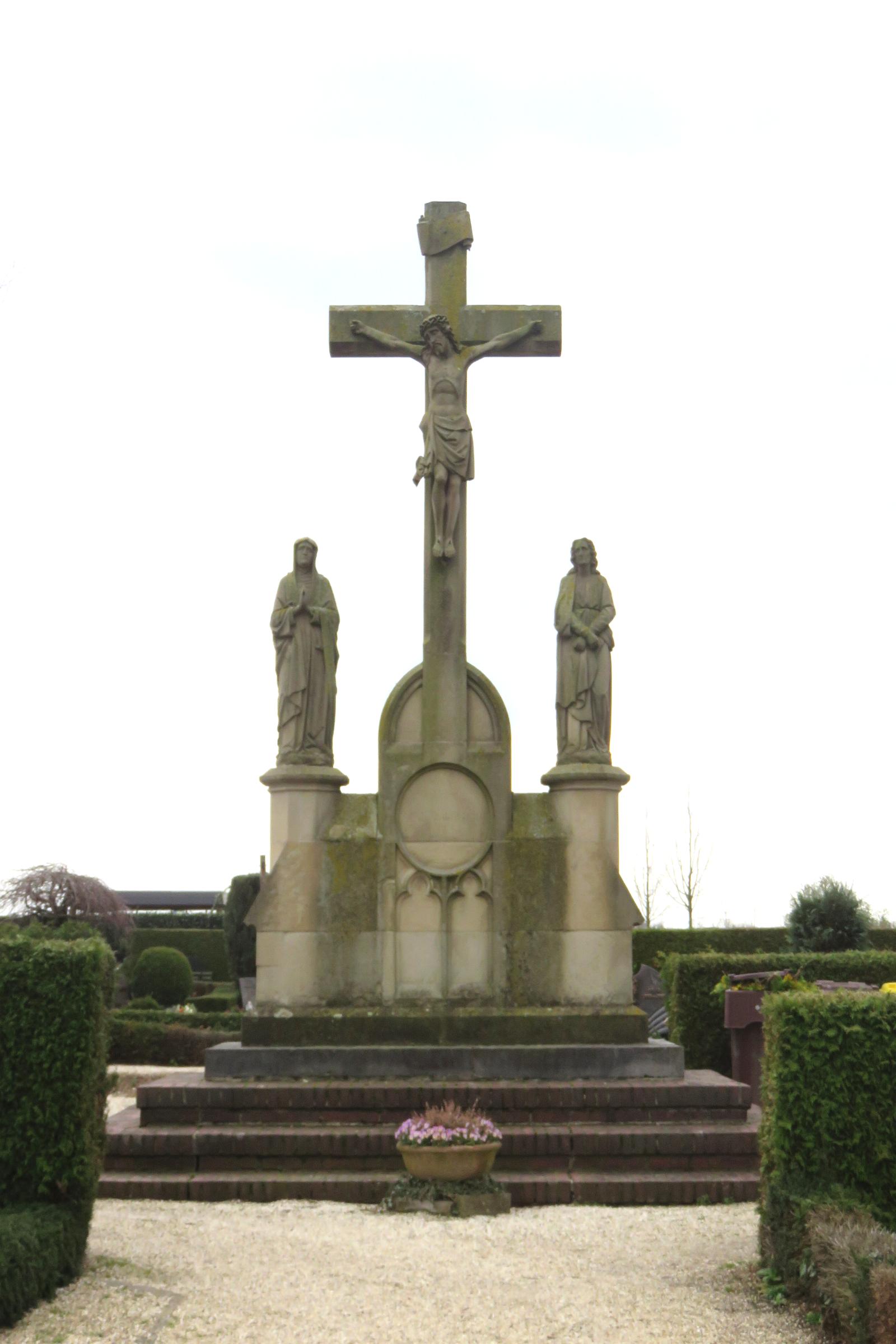 Standort: Das Friedhofskreuz als Kreuzigungsgruppe dargestellt bildet den Mittelpunkt des Friedhofs an der Friedhofstraße in Amern. Beschreibung: Bei dem Friedhofskreuz handelt es sich um eine ca. 4,00 m hohe Kreuzigungsgruppe. Sie steht auf einem fünfstufigen Podest und ist Bestandteil der Friedhofanlage.