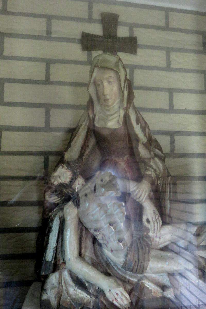 Standort: Die Sektionskapelle befindet sich in Börholz 54 im Ortsteil Börholz. Die Kapelle steht mit der Nr. 62 in der Denkmalliste der Gemeinde Brüggen unter Denkmalschutz. Denkmalbeschreibung: Backsteinkapelle auf rechteckigem Grundriss, gemäß Inschriftstein errichtet 1890 als Ersatz für einen Vorgängerbau aus dem Jahr 1699. Vorne und seitlich Spitzbogenöffnungen, der Eingang mit bauzeitlicher zweiflügeliger Holztür; die Gebäudekanten werden durch leicht überhohte Eckpfeiler betont; über dem Eingang ein Giebelkreuz. Kupferdach aus den 1990er Jahren; an drei Seiten alte schmiedeeiserne Einfriedung (nach vorn erneuert). Im Inneren kunsthistorisch wertvolles Vesperbild, Eiche mit Resten der ursprünglichen Fassung, H. 48 cm, um 1480 entstanden. Der rechte Fuß des Heilandes bis zum Wadenansatz sowie der rechte Unterarm früher ergänzt, an der Plinthe rechts und links ein Stück abgebrochen. – Laut Pfarrchronik, S. 22 soll das Andachtsbild aus dem Wachtendonker Kloster stammen. Bei einer Restaurierung 1968 durch den Landeskonservator wurde die Originalfassung freigelegt bzw. beim Inkarnat Christi eine Zweitfassung. Das Gewand Mariens und das Leichentuch, der Körper Christi und der Kopf der Mutter Gottes retuschiert. – Die knieende Muttergottes neigt sich dem Leichnam Christi zu, dessen Kopf auf Ihrem rechten vorgestellten Knie ruht und von ihrer rechten Hand gehalten wird, während sie mit ihrer Linken den linken Arm Christi umgreift, dessen Körper zum Boden hinabgesunken ist. Die ganze Gruppe ist umgeben von dem fülligen Gewand Mariens. – Im Typus (mit der vor dem Sohn knieenden und ihn zugleich stützenden Gottesmutter) verwandt mit den Vesperbildern in Siegburg – Wolsdorf, Bedburg, Kr. Kleve und Rheinberg. Stilistisch jedoch eher einer nach Köln zu lokalisierenden Gruppe nahe stehend, wie die Vesperbilder aus Bergheim (Pfarrkirche) und vor allem aus dem Schnütgen-Museum in Köln. Als Kapelle der Sektion Börholz ist das Gebäude bedeutend für Brüggen. Als anschauliches und lebendiges Zeugnis der Volksreligiösität besteht an der Erhaltung und Nutzung aus volkskundlicher und im Bezug auf das Vesperbild, künstlerischen Gründen ein öffentliches Interesse. Quellenhinweis: * Dritte Ausgabe 1994: Handbuch des Bistums Aachen ISBN 3-87448-172-7 * Denkmal Nr. 62 der Denkmalliste Brüggen