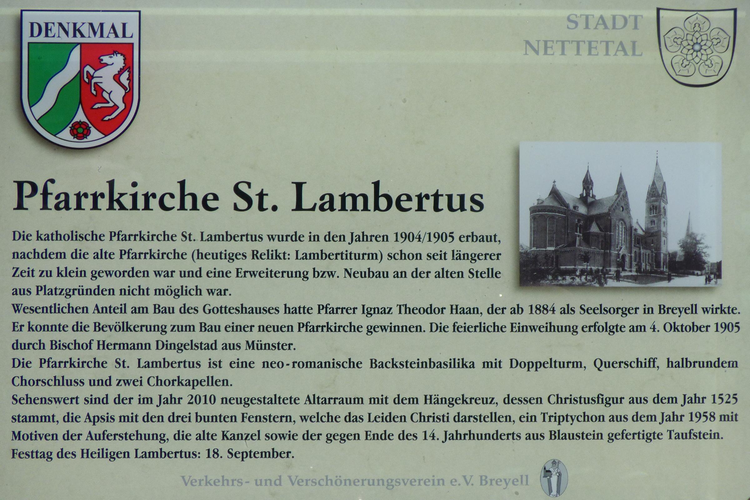 Standort: Die Kirche St. Lambertus hat ihren Standort am Lambertimarkt im Stadtteil Nettetal - Breyell. Sie steht mit der Nr. 70 in der Denkmalliste Nettetal unter Denkmalschutz. Denkmalbeschreibung: