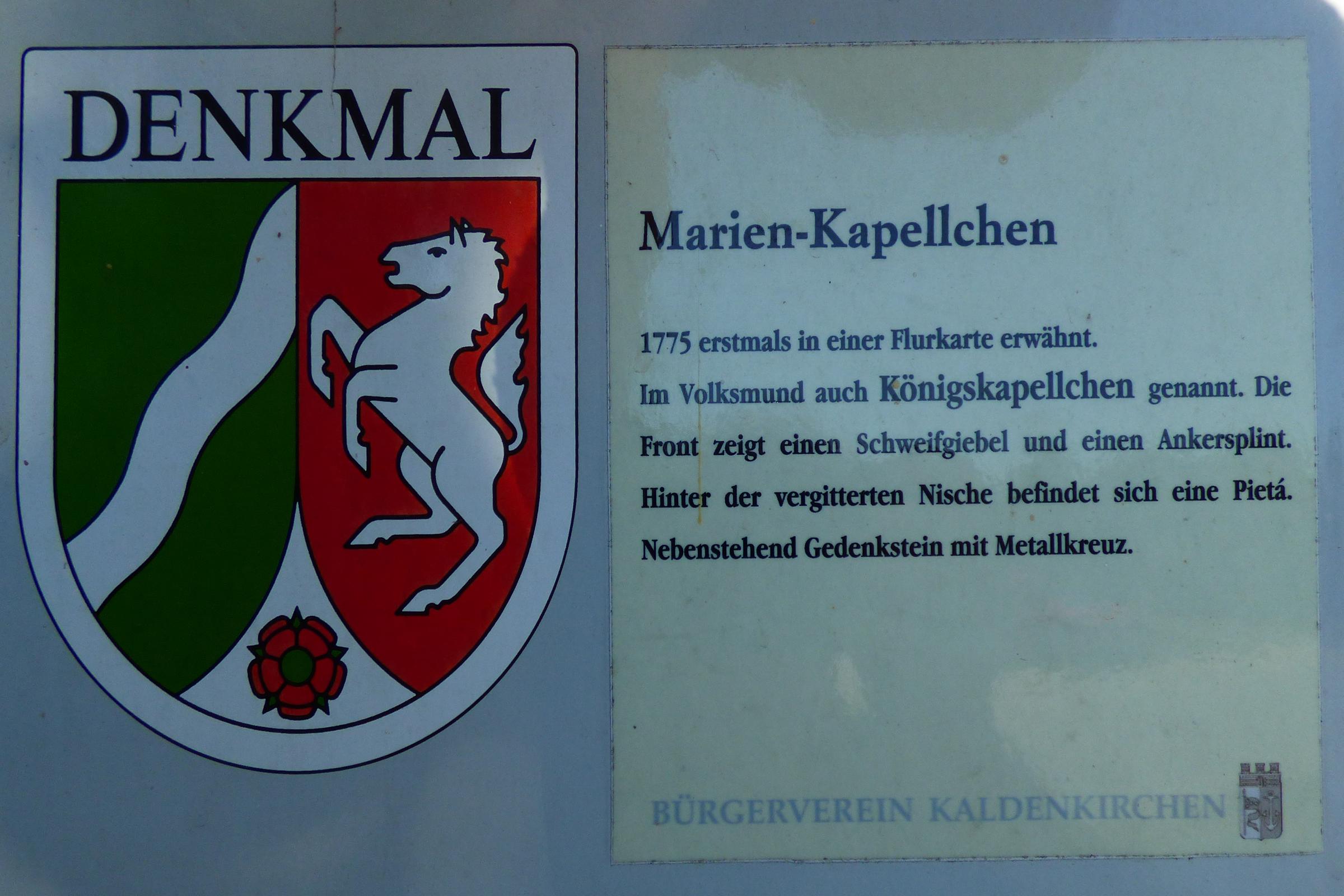 Standort: Die Königskapelle hat ihren Standort an der Straße Am Altenhof, im Stadtteil Nettetal - Kaldenkirchen. Sie steht mit der Nr. 40 in der Denkmalliste Nettetal unter Denkmalschutz. Denkmalbeschreibung: