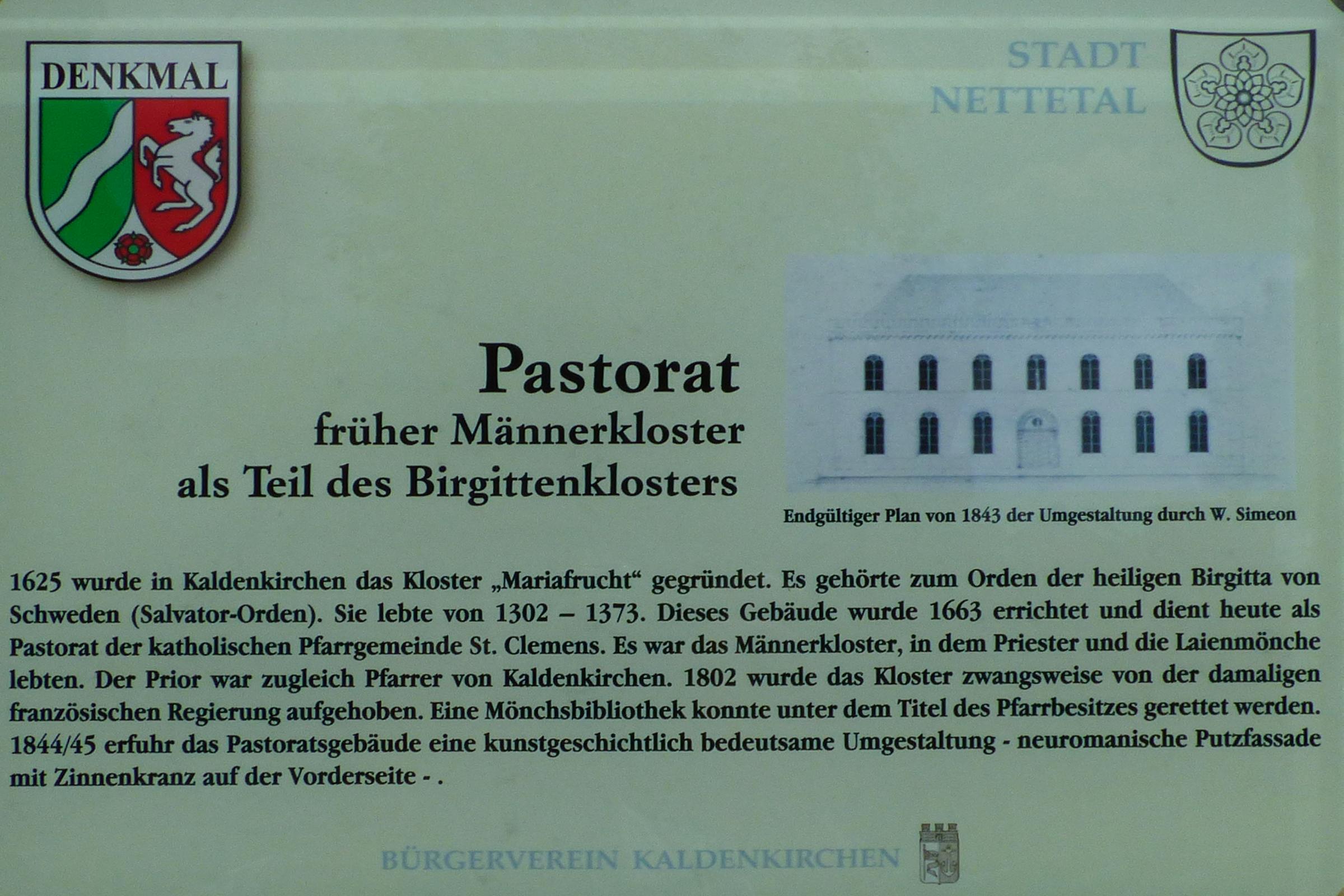 Standort: Die Pastorat St. Klemens hat ihren Standort an der Kehrstraße im Stadtteil Nettetal - Kaldenkirchen. Sie steht mit der Nr. 115 in der Denkmalliste Nettetal unter Denkmalschutz. Denkmalbeschreibung: