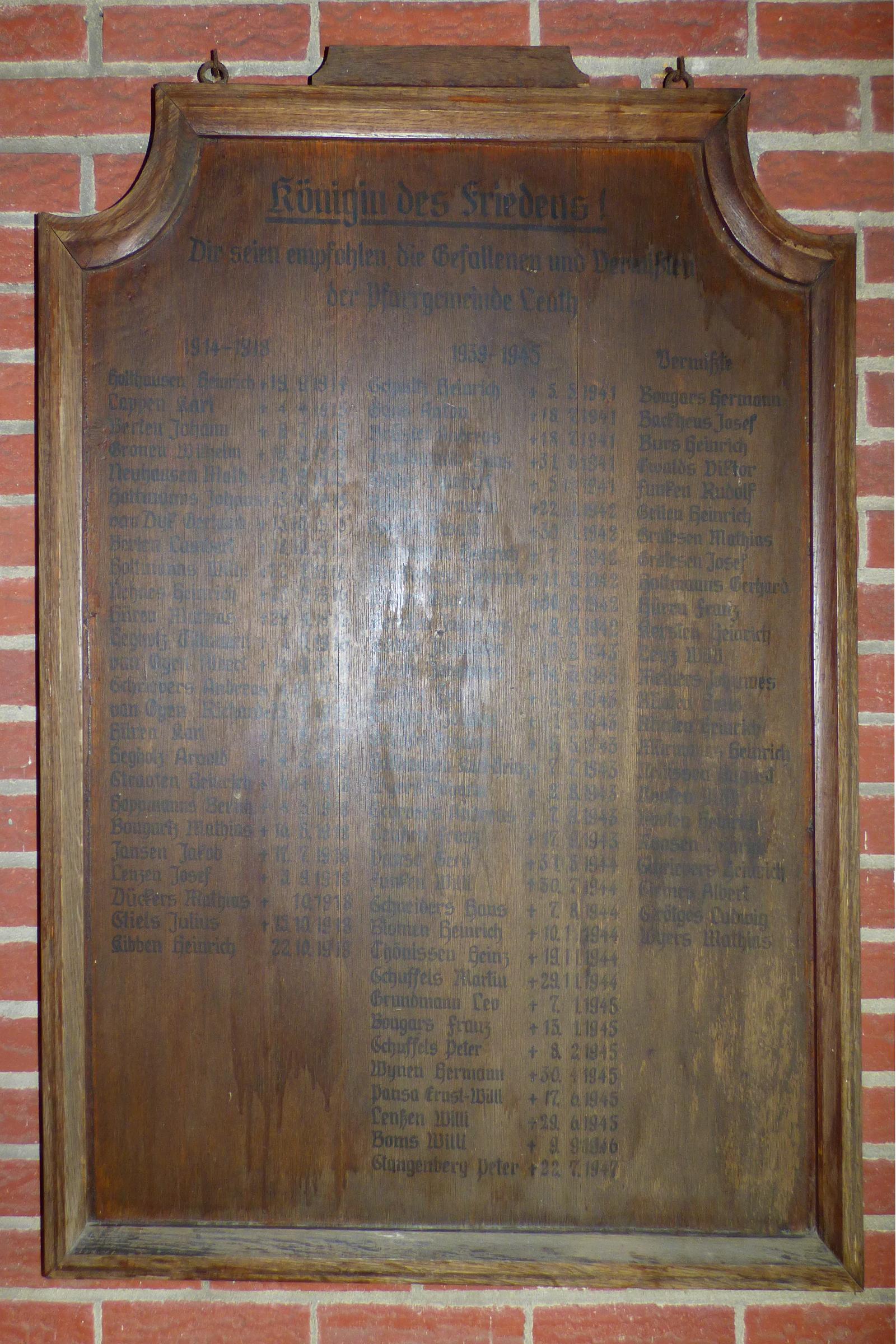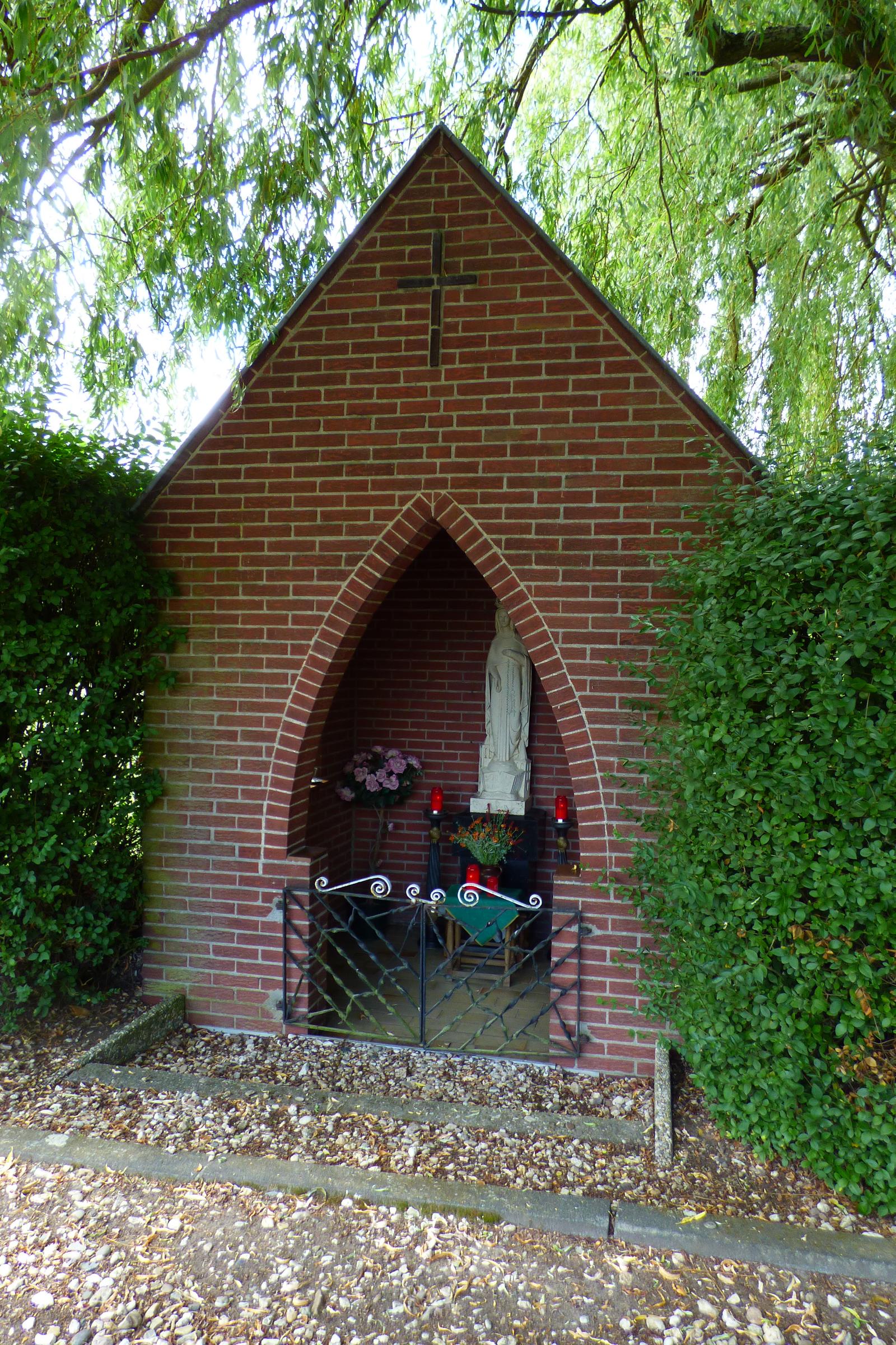 Standort: Die Marienkapelle hat ihren Standort am Deller Weg, im Stadtteil Nettetal - Leuth. Sie wurde am 8. Dezember 1954 eingeweiht. Denkmalbeschreibung: Bei der Marienkapelle handelt es sich um einen spitzbogigen Ziegelsteinbau unter einen Satteldach. Eine etwa 1,0 m hohe Marienfigur sowie Kerzen- und Blumenschmuck zieren die Kapelle. Der Eingangsbereich wird durch ein schmiedeeisernes Ziergitter verschönert. An der rechten Innenwand befindet sich eine Gedenktafel. Darauf steht: Königin des Friedens. Dir seien empfohlen die Gefallenen und Vermißten beider Weltkriege der Pfarrgemeinde Leuth. Die Gedenktafel ist ein wichtiges Zeugnis für die Geschichte des Ortes Leuth. Erhaltung und Nutzung liegen aus ortsgeschichtlichen Gründen im öffentlichen Interesse. Sie soll den Lebenden zur Mahnung und den Verstorbenen zur Ehre dienen. Quellenhinweis: * Dritte Ausgabe 1994: Handbuch des Bistums Aachen ISBN 3-87448-172-7 * Fast vergessen: Kapelle des Friedens am Schwanenhaus (R.P. 18. Januar 2017)