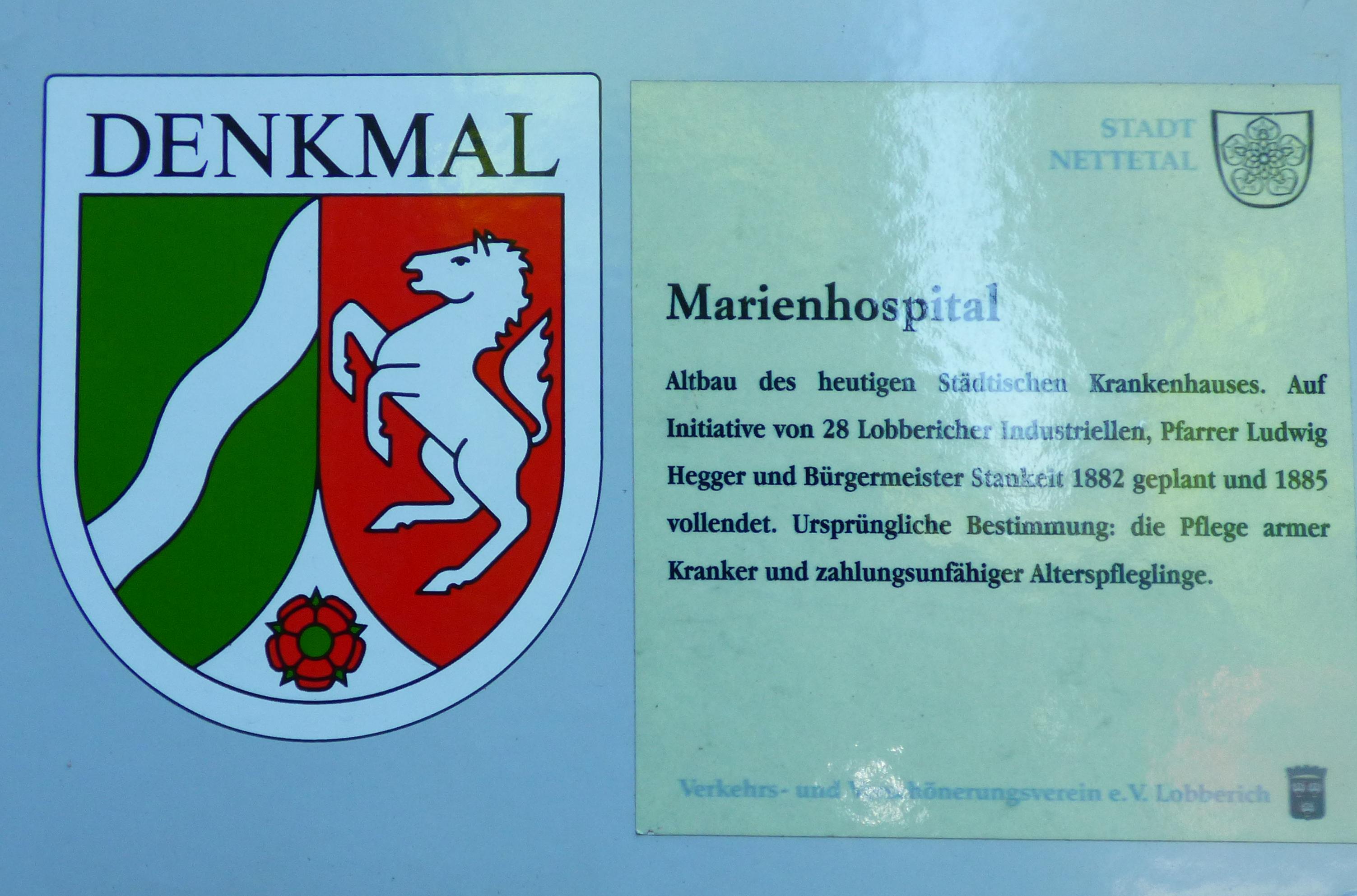 Standort: Das Marienhospital hat seinen Standort an der Sassenfelder Straße 1 im Stadtteil Nettetal - Lobberich. Das Marienhospital steht mir der Nr. 43 in der Denkmalliste Nettetal unter Denkmalschutz. Das Marienhospital ist heute in das Städtische Krankenhaus eingegliedert. Im Spitzgiebel hat eine Heiligenfigur ihren Platz. Die Kapelle ist ebenfalls noch vorhanden und wird separat beschrieben. Denkmalbeschreibung: