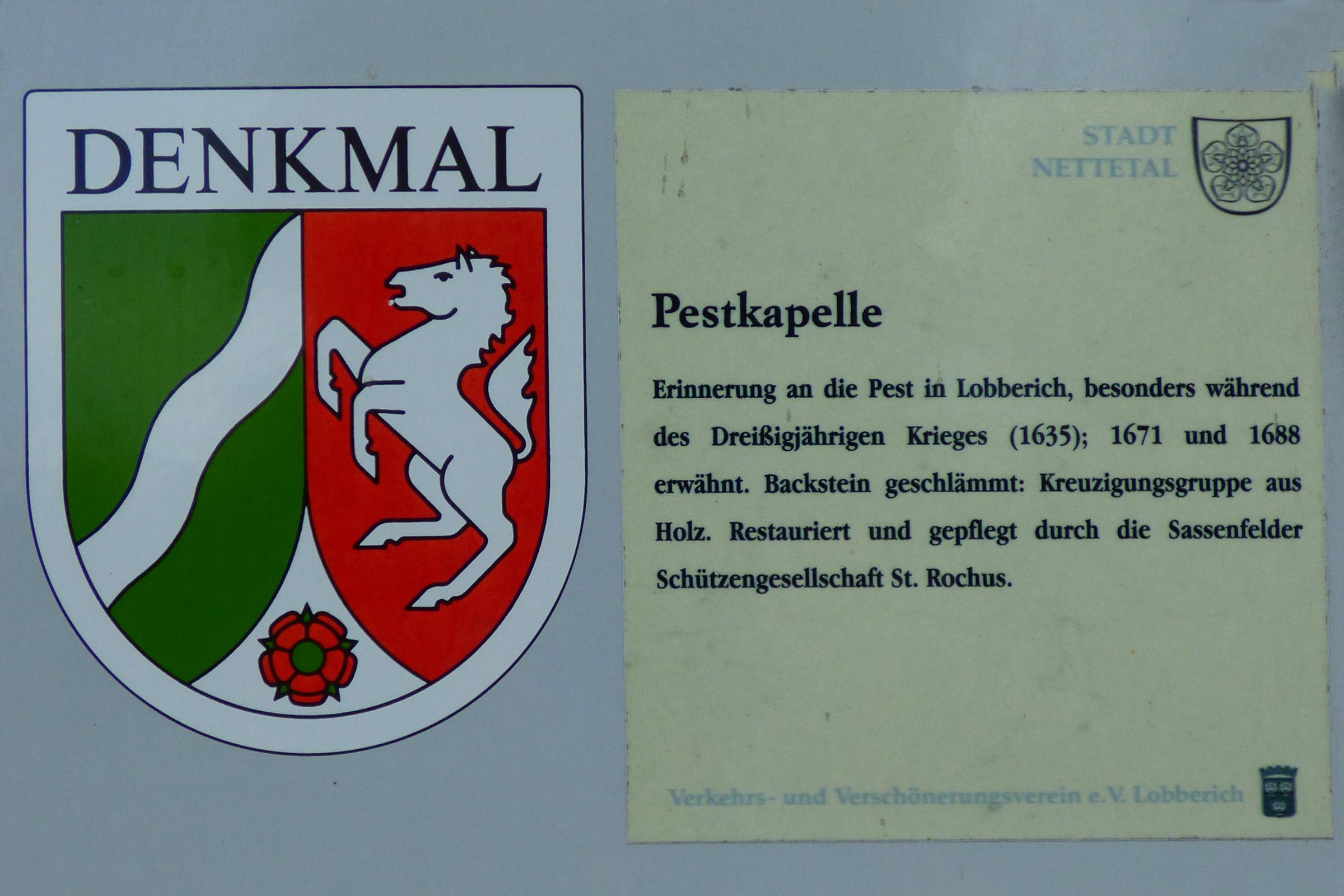 Standort: Die Pestkapelle hat ihren Standort am Sassenfeld 48/49. Sie steht mit der Nr. 57 in der Denkmalliste Nettetal unter Denkmalschutz. Denkmalbeschreibung: