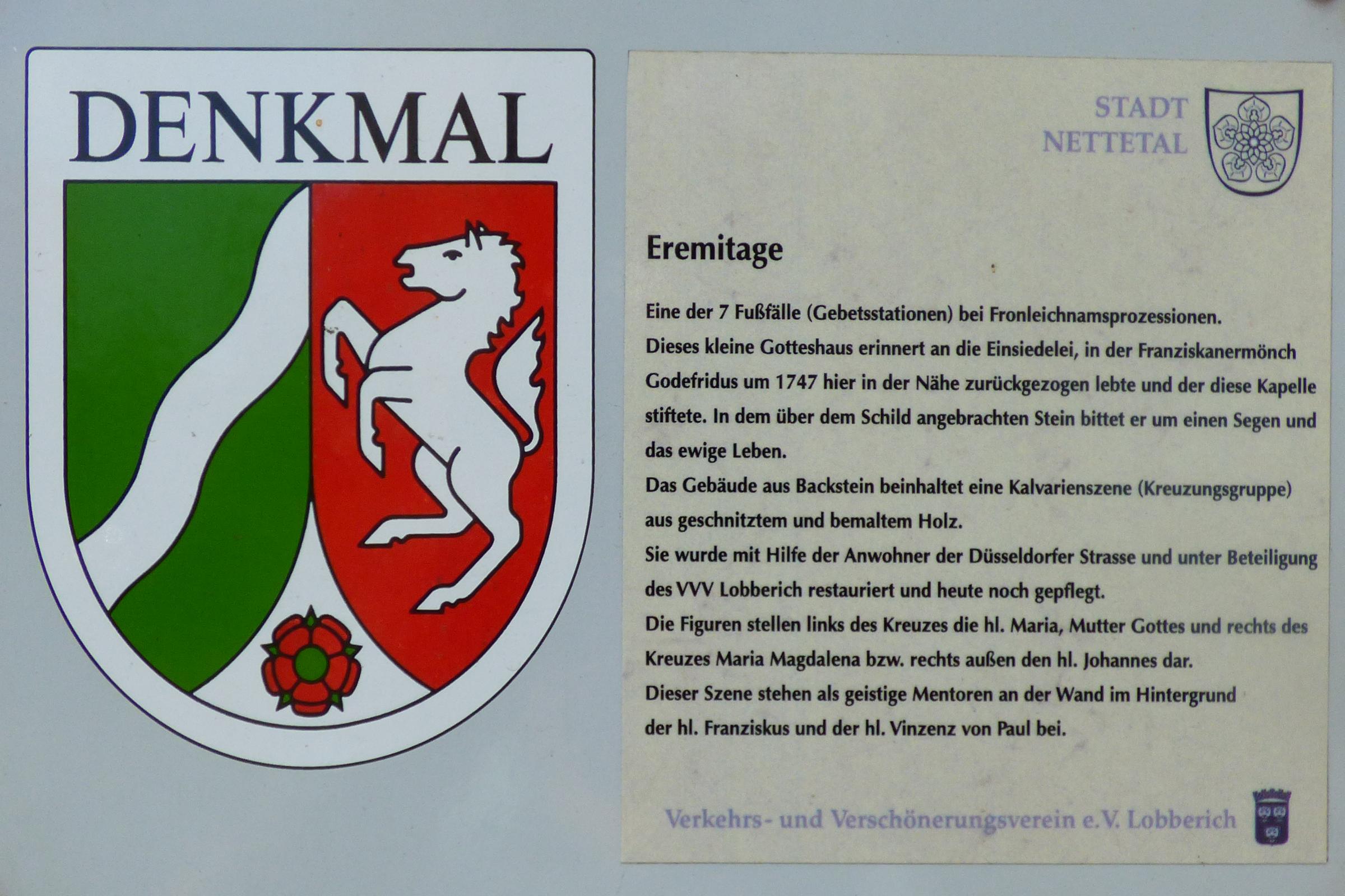 Standort: Die Wegekapelle hat ihren Standort an der Düsseldorfer Straße 44, im Stadtteil Nettetal - Lobberich. Sie steht mit der Nr. 143 in der Denkmalliste Nettetal unter Denkmalschutz. Denkmalbeschreibung: