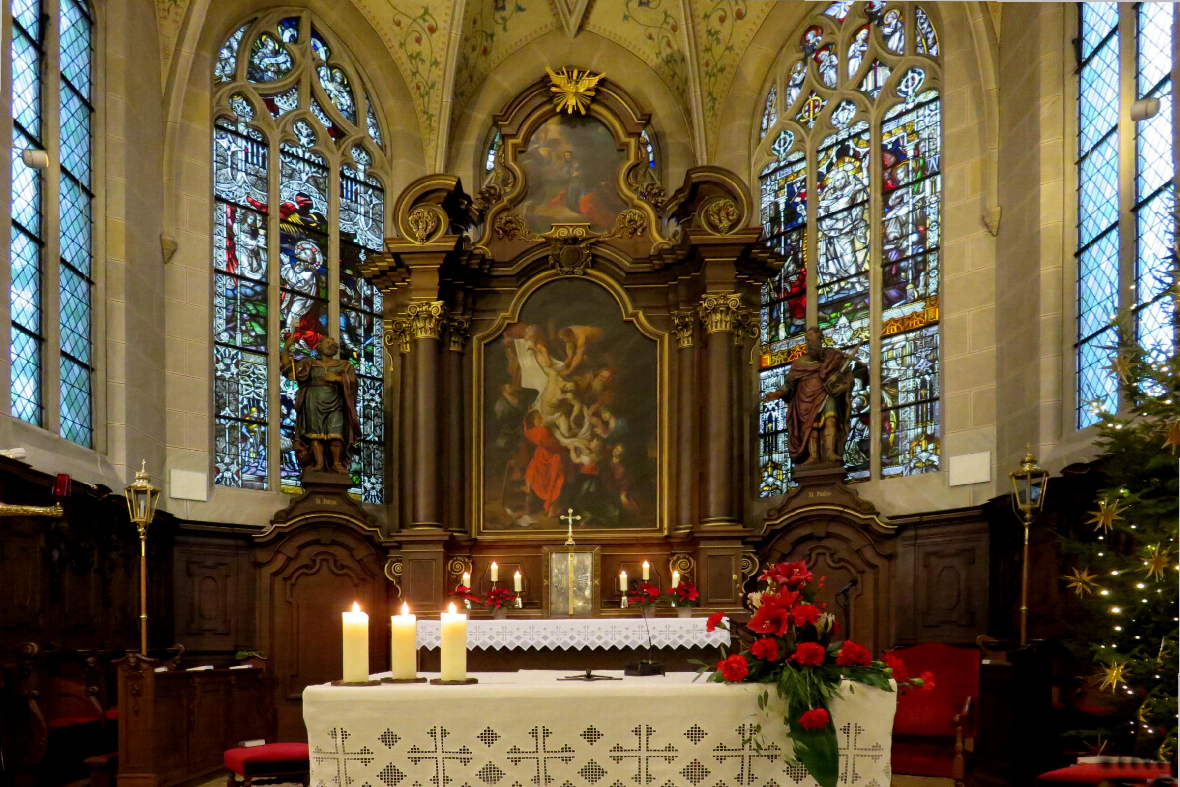 in die Chormauer eingelassene Blaustein-Grabsteine des 17. Jh.;