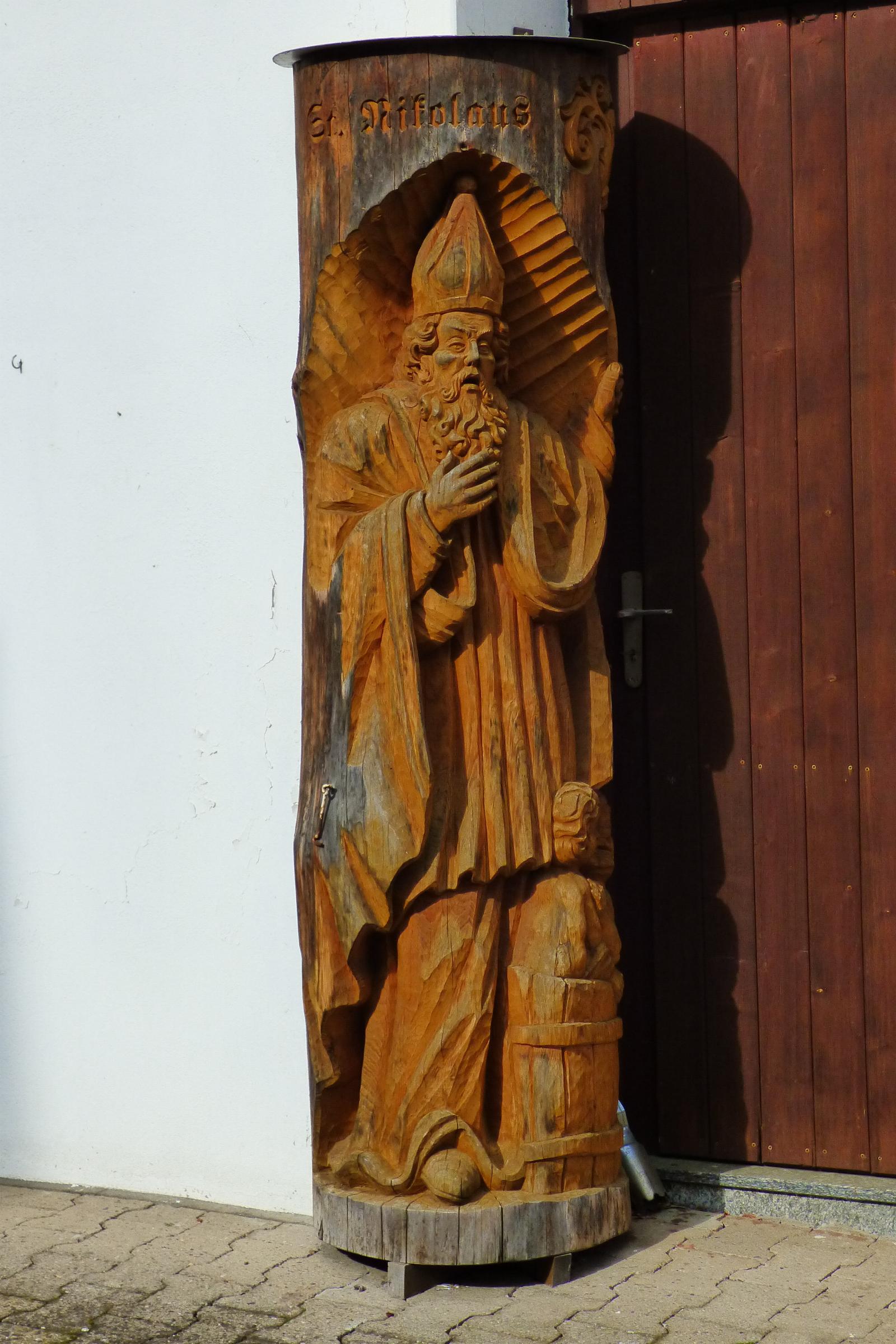 Standort: Die Nikolausfigur hat ihren Standort am Burgweiherplatz in Brüggen. Beschreibung: Bei der Nikolaus Figur handelt es sich um eine ca. 2,00 m hohe Schnitzfigur aus einem Baumstamm.
