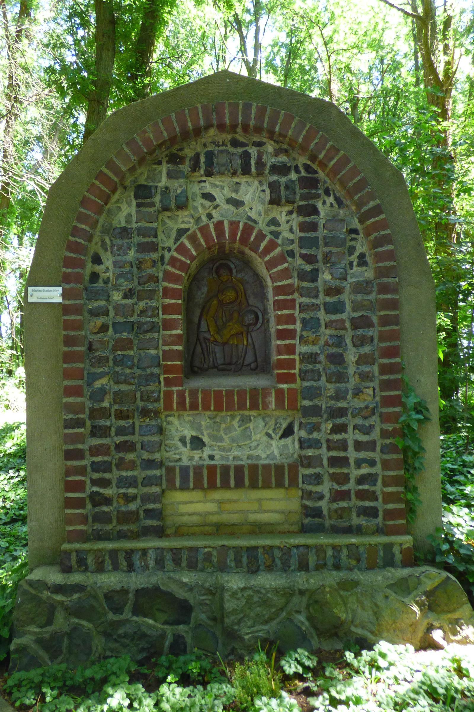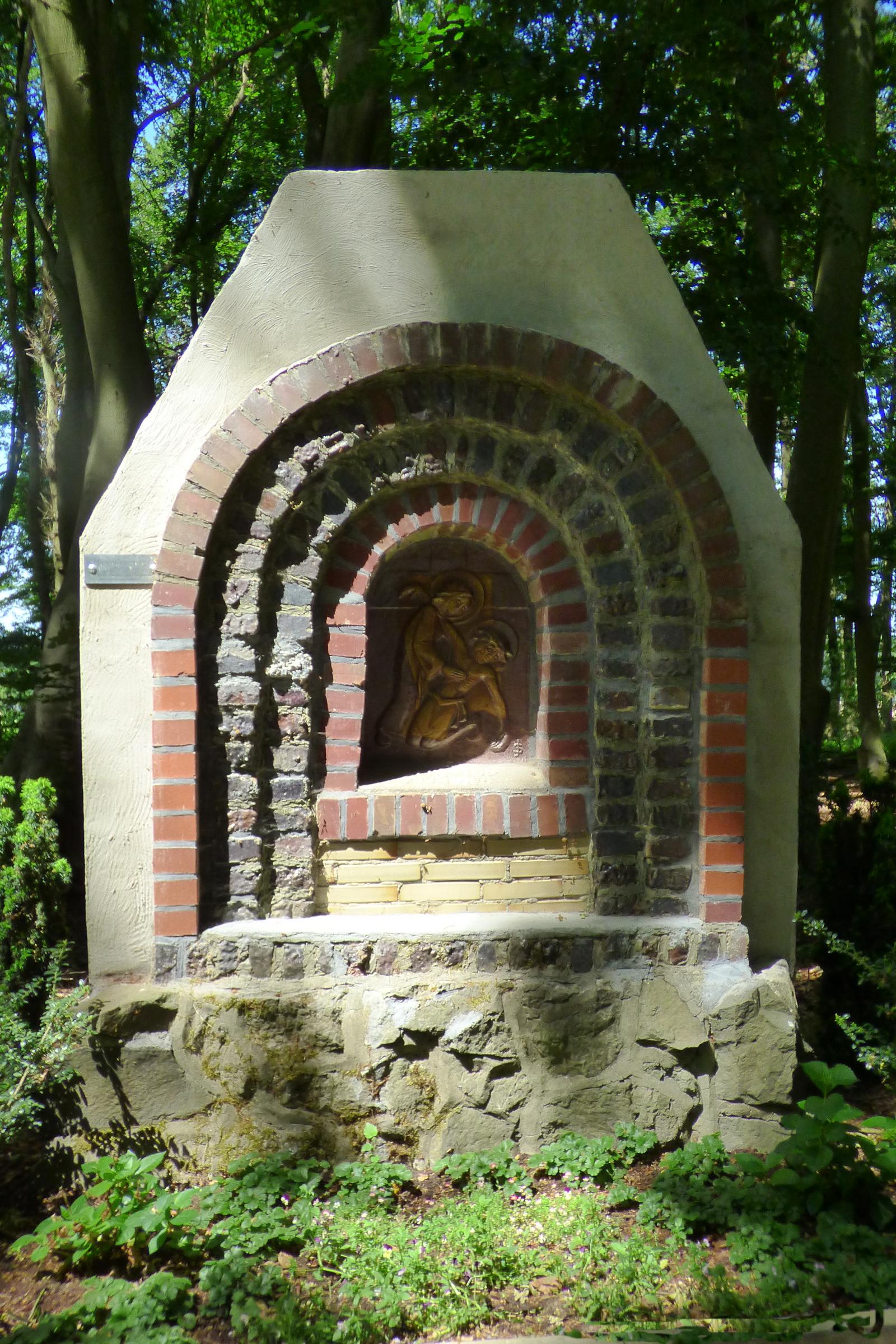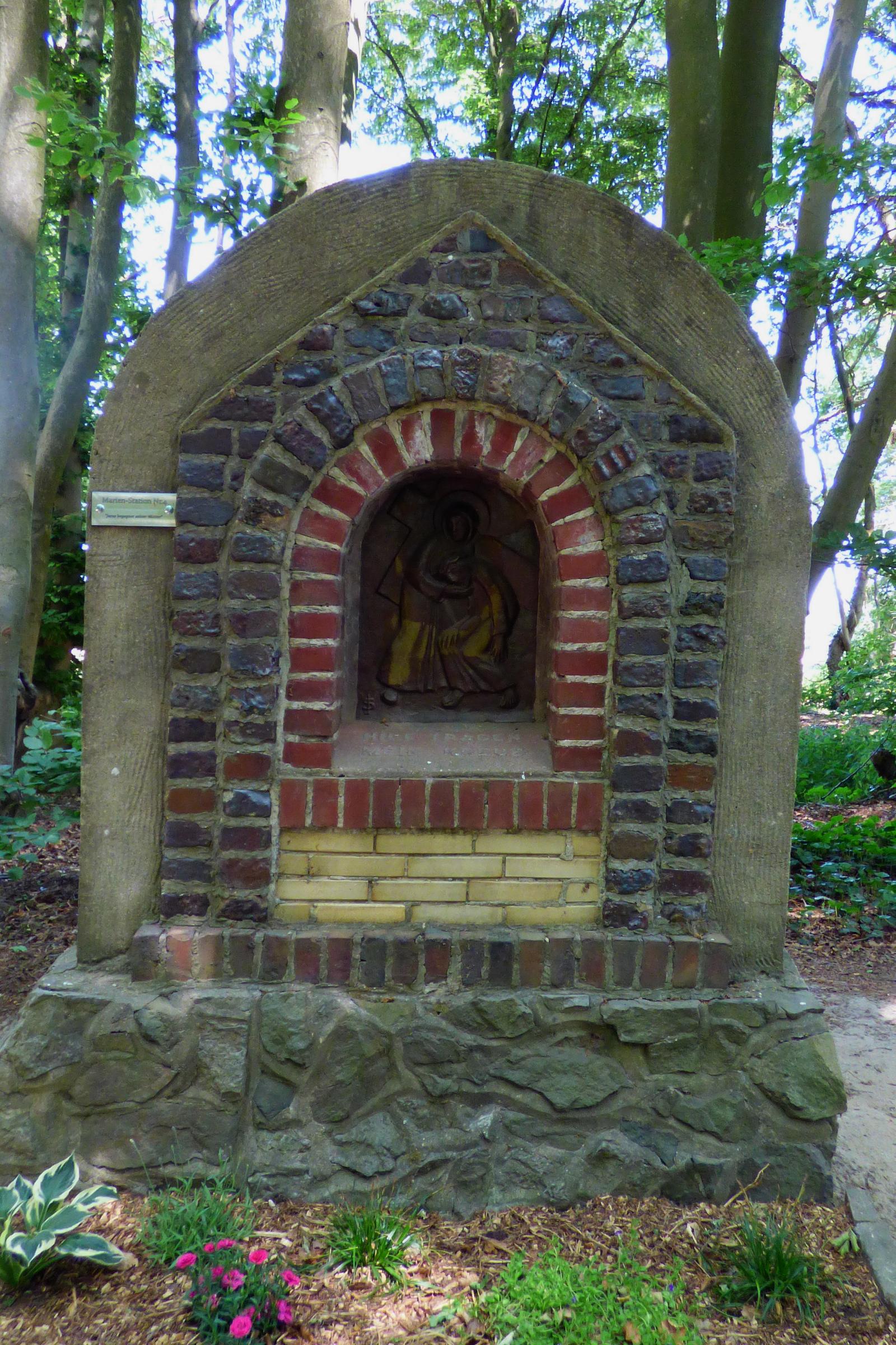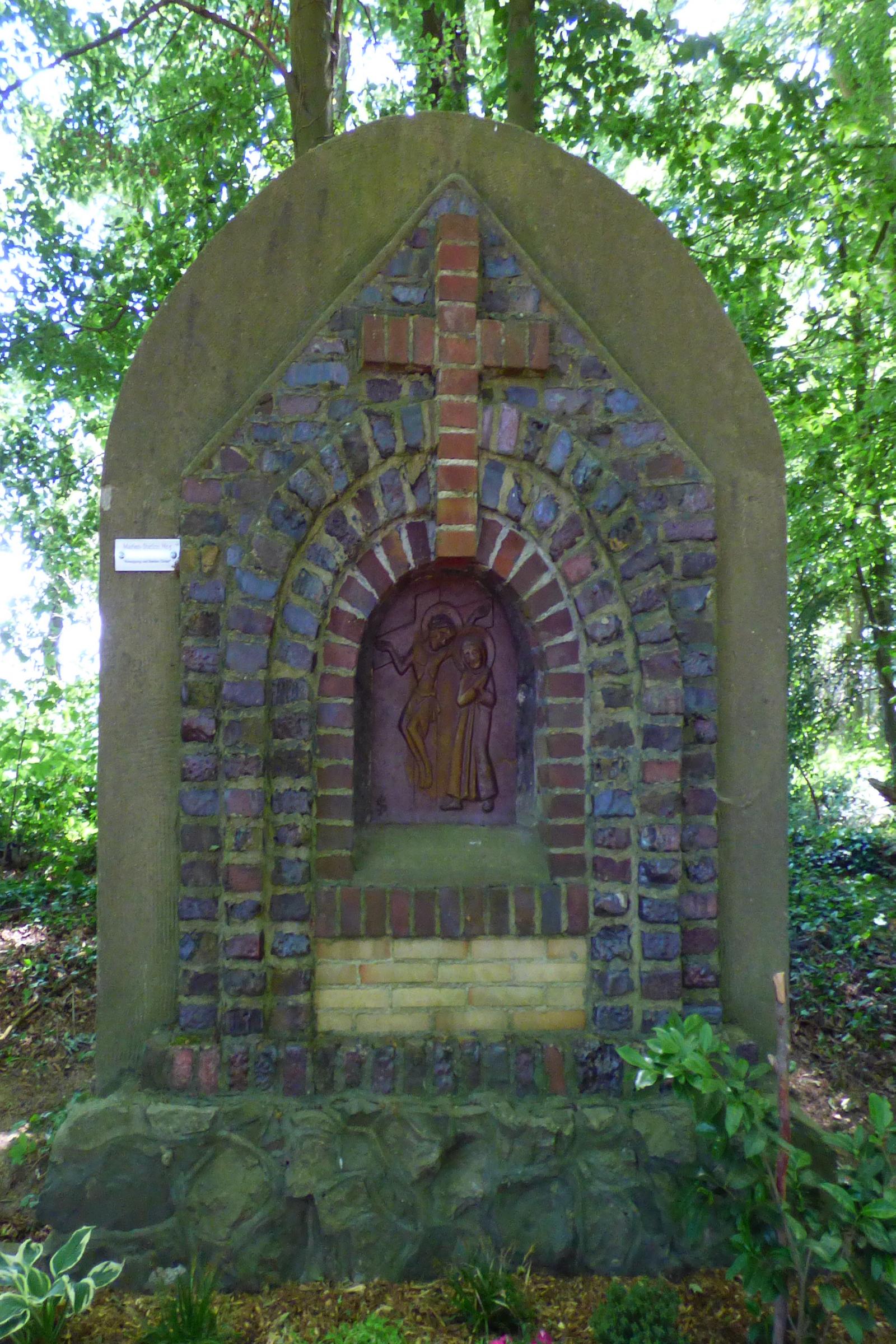 Standort Die 7 Marienstationen befinden sich auf der Kreuzgartenanlage am Kreuzgartenweg in Schaag. Beschreibung der Stationen: Die 7 Marienstationen stehen an einem Rundweg der durch die Kreuzgartenanlage führt. Es handelt sich um meist rundbogig gemauerte Objekte mit einer Höhe von ca. 2,50 m . In der Mitte der Station ist jeweils eine Tafel mit der Mariendarstellung zu sehen. Beschreibung der Kreuzgartenanlage: Der Kreuzgarten wurde auf Anregung des Pfarrers i. R. Peter Schallenberg 1950 erbaut. An dieser Stelle befand sich zur damaligen Zeit an der Karstraße ein gesprengter Westwallbunker. Nach dem Anlegen von Wegen entstanden hier Kreuzwegstationen. Direkt im Anschluß an den Kreuzgarten ist seit 1951 der Mariengarten entstanden. In einem sechs Meter hohen altarähnlichen Aufbau steht die Schutzmantel-Madonna. Diese Marienstatue stammt von dem Künstler Peter Bahn aus Höhr-Grenzhausen. Im Laufe der Jahre wurde die Kreuzgartenanlage stetig erweitert. Zur Anlage gehören heute 14 Kreuzwegstationen, 7 Marienstationen, ein Gedächtnismalmal, eine Ölberggrotte, ein Hochkreuz, eine Christusfigur, eine Marienaltar mit einer Marienmadonna, ein Ehrenmal mit den Namenstafeln der gefallenen und vermißten Soldaten des Zweiten Weltkrieges und eine Gedenktafel des Begründer dieser Anlage . Quellenhinweis: |