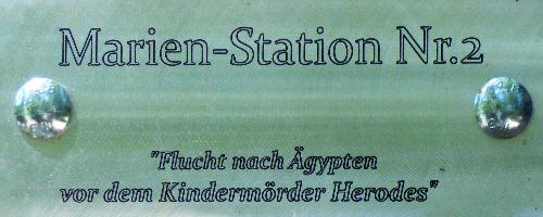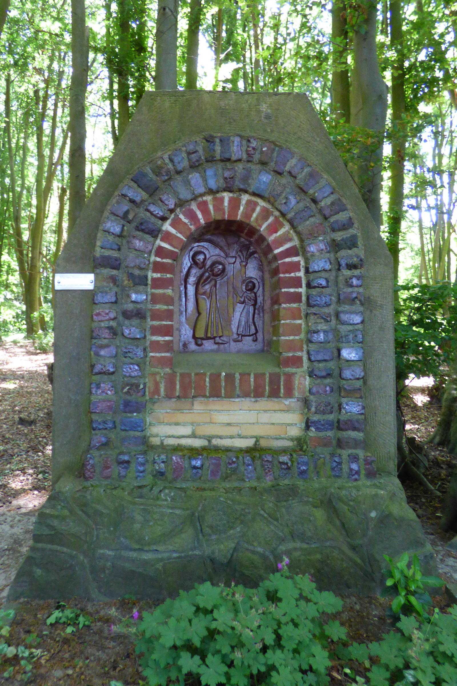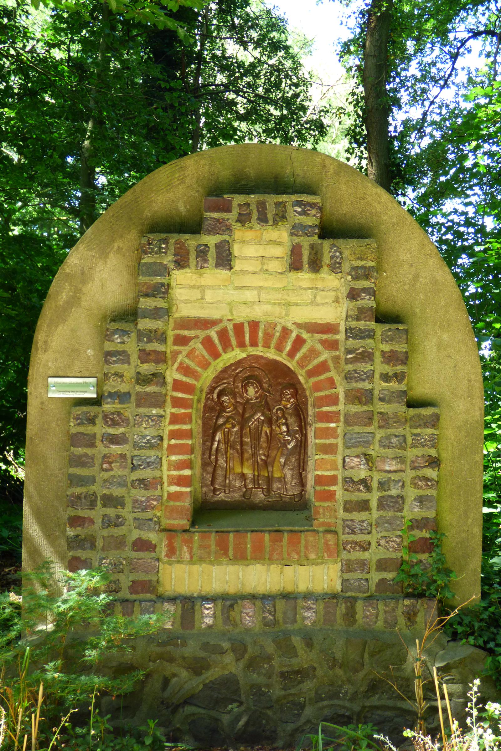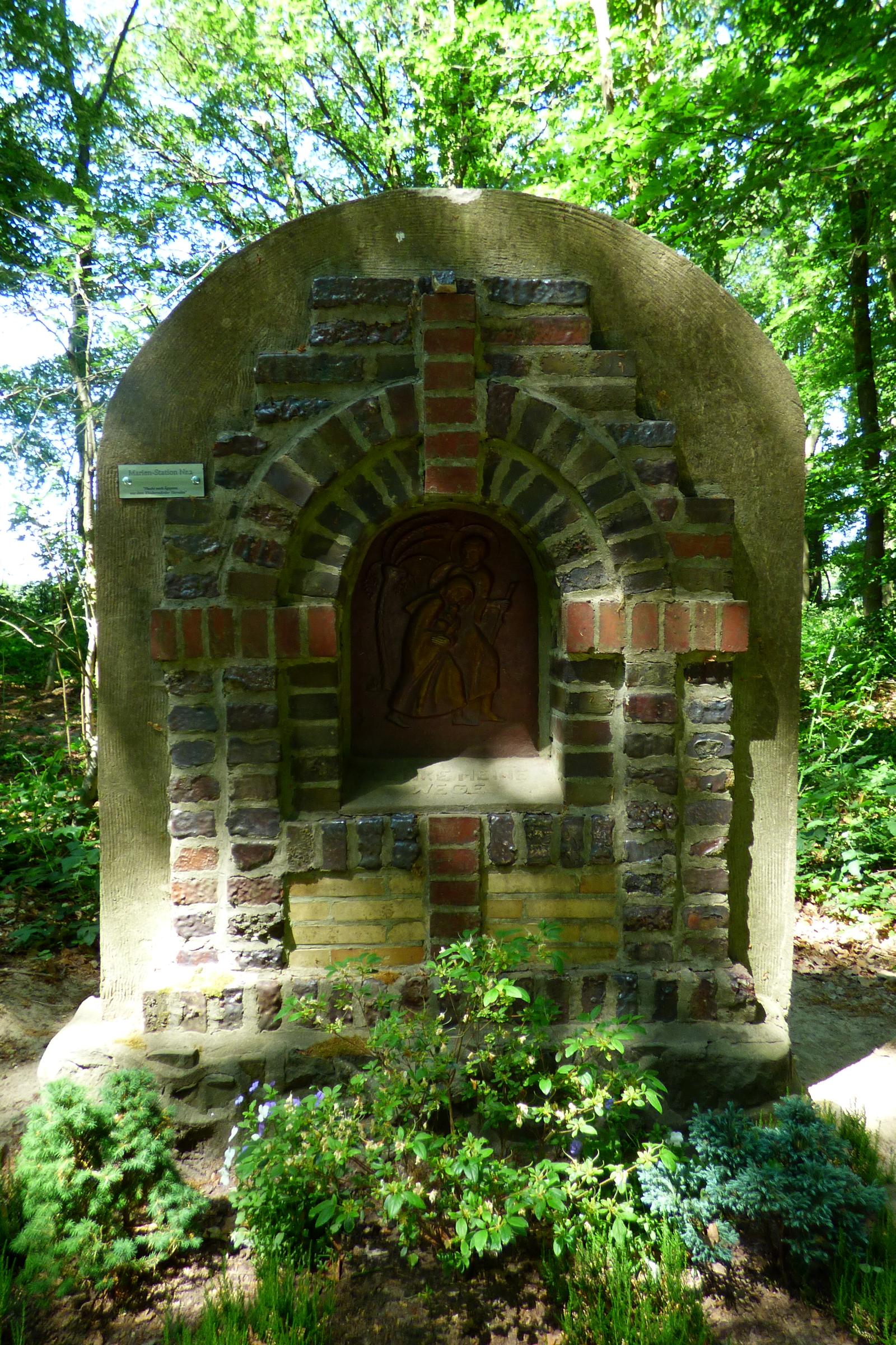 Standort Die 7 Marienstationen befinden sich auf der Kreuzgartenanlage am Kreuzgartenweg in Schaag. Beschreibung der Stationen: Die 7 Marienstationen stehen an einem Rundweg der durch die Kreuzgartenanlage führt. Es handelt sich um meist rundbogig gemauerte Objekte mit einer Höhe von ca. 2,50 m . In der Mitte der Station ist jeweils eine Tafel mit der Mariendarstellung zu sehen. Beschreibung der Kreuzgartenanlage: Der Kreuzgarten wurde auf Anregung des Pfarrers i. R. Peter Schallenberg 1950 erbaut. An dieser Stelle befand sich zur damaligen Zeit an der Karstraße ein gesprengter Westwallbunker. Nach dem Anlegen von Wegen entstanden hier Kreuzwegstationen. Direkt im Anschluß an den Kreuzgarten ist seit 1951 der Mariengarten entstanden. In einem sechs Meter hohen altarähnlichen Aufbau steht die Schutzmantel-Madonna. Diese Marienstatue stammt von dem Künstler Peter Bahn aus Höhr-Grenzhausen. Im Laufe der Jahre wurde die Kreuzgartenanlage stetig erweitert. Zur Anlage gehören heute 14 Kreuzwegstationen, 7 Marienstationen, ein Gedächtnismalmal, eine Ölberggrotte, ein Hochkreuz, eine Christusfigur, eine Marienaltar mit einer Marienmadonna, ein Ehrenmal mit den Namenstafeln der gefallenen und vermißten Soldaten des Zweiten Weltkrieges und eine Gedenktafel des Begründer dieser Anlage . Quellenhinweis: |