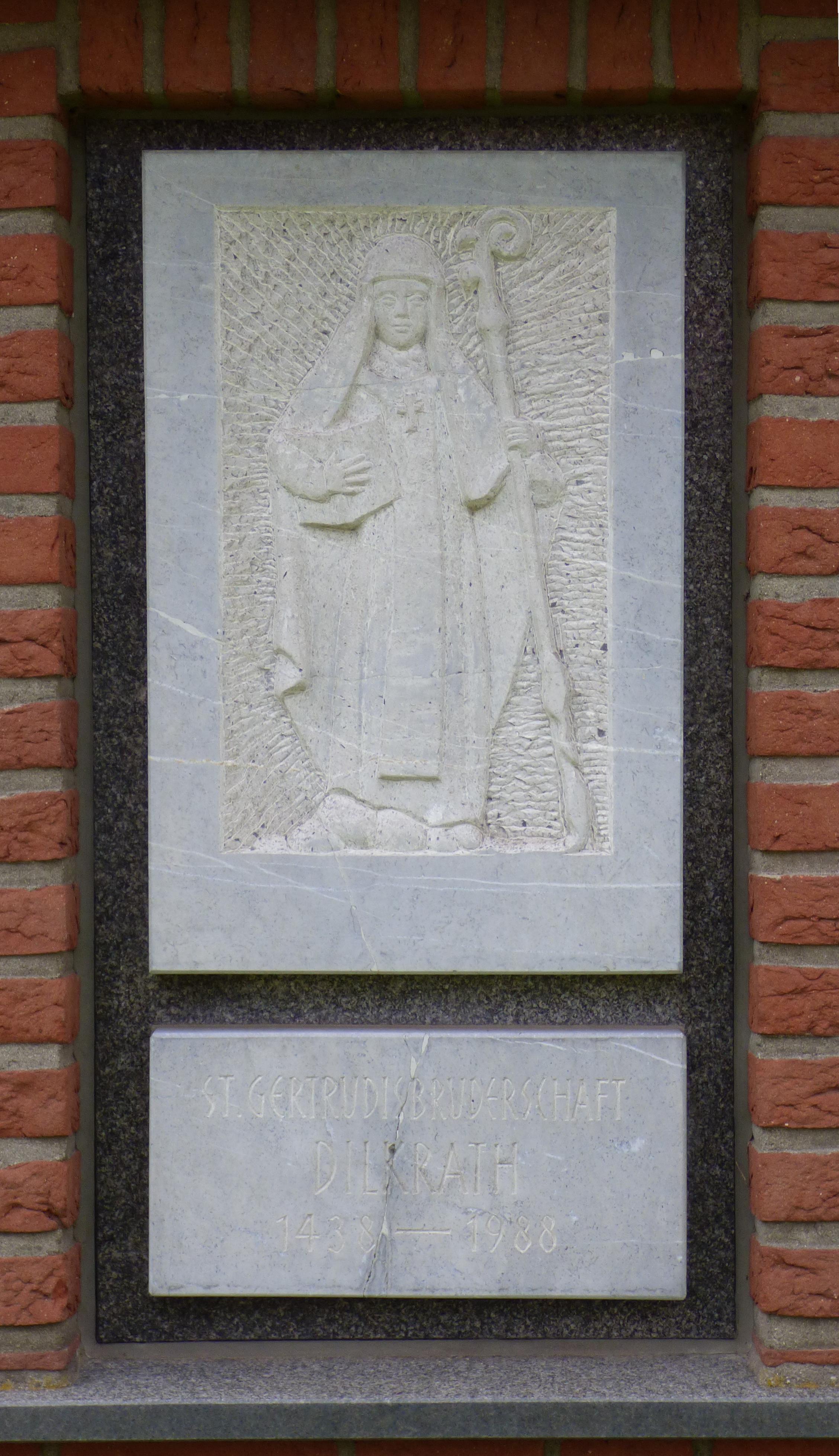 Standort: Der St. Gertrudis Bildstock hat seinen Standort an Heidend 13 in Dilkrath. Beschreibung: Bei dem Bildstock handelt es sich um einen ca. 2,50 m hohen gemauerten Bildstock aus Ziegelstein. Ein überstehendes Zeltdach aus Kupfer ist mit einem Kreuz bekrönt. In der Vorderseite ist auf einer Tafel das Relief der Hl. Gertrudis zu sehen. Auf der unteren Tafel steht die Inschrift: ST. G E R T R U D I S B R U D E R S C H A F T D I L K R A T H 1 4 2 3 - 1 9 8 8 Quellenhinweis: * Dritte Ausgabe 1994: Handbuch des Bistums Aachen ISBN 3-87448-172-7