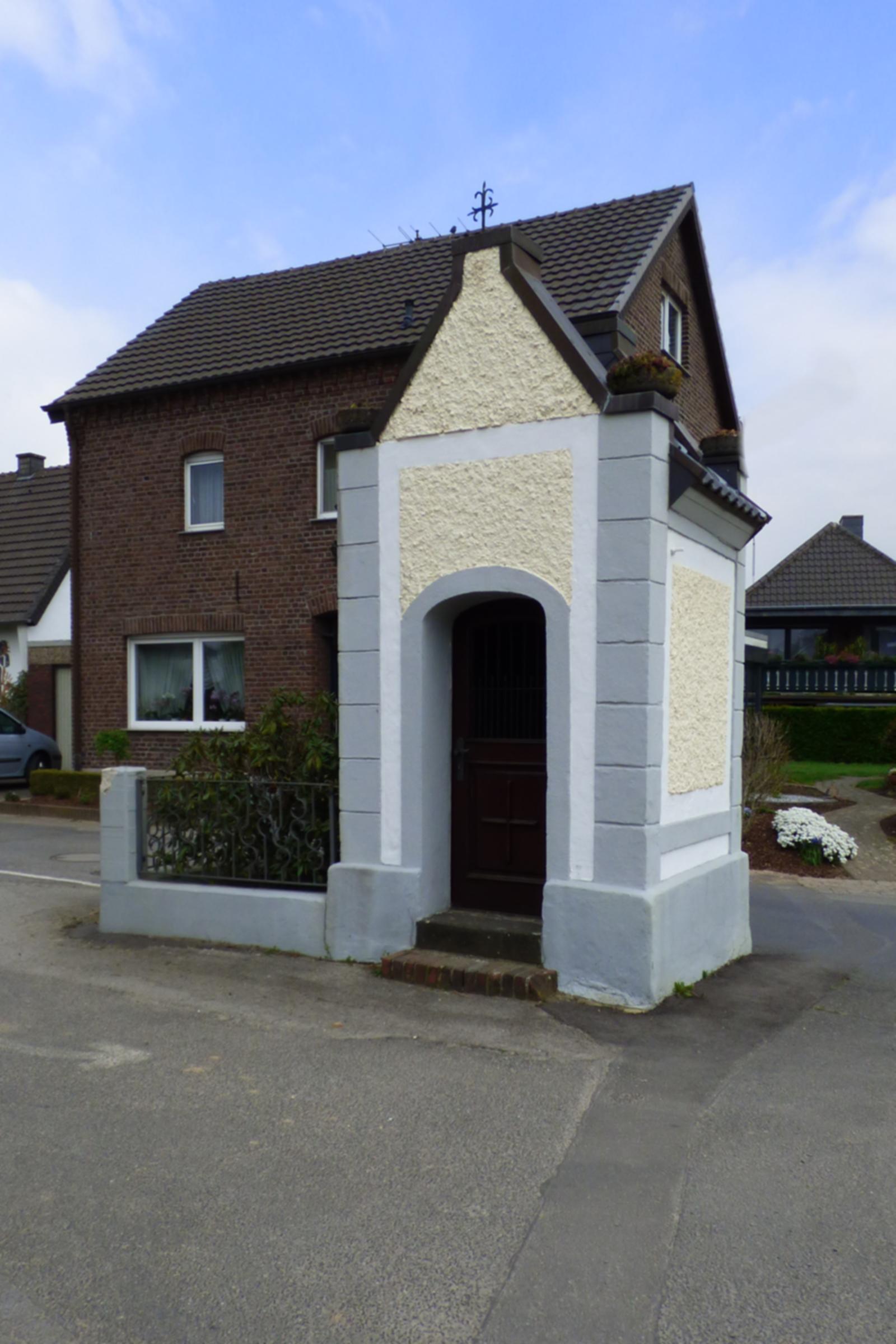 Denkmalbeschreibung: Das Kapellchen wurde im 17. Jahrhundert aus Backstein auf quadratischem Grundriß mit übergiebelter Front und Rückseite errichtet. Zu diesem Zeitpunkt wurde sie mit Eckquaderung rauverputzt. Die Nische mit Madonnenfigur wurde im Jahr 1907 eingebaut. Quellenhinweis: * Dritte Ausgabe 1994: Handbuch des Bistums Aachen ISBN 3-87448-172-7 |