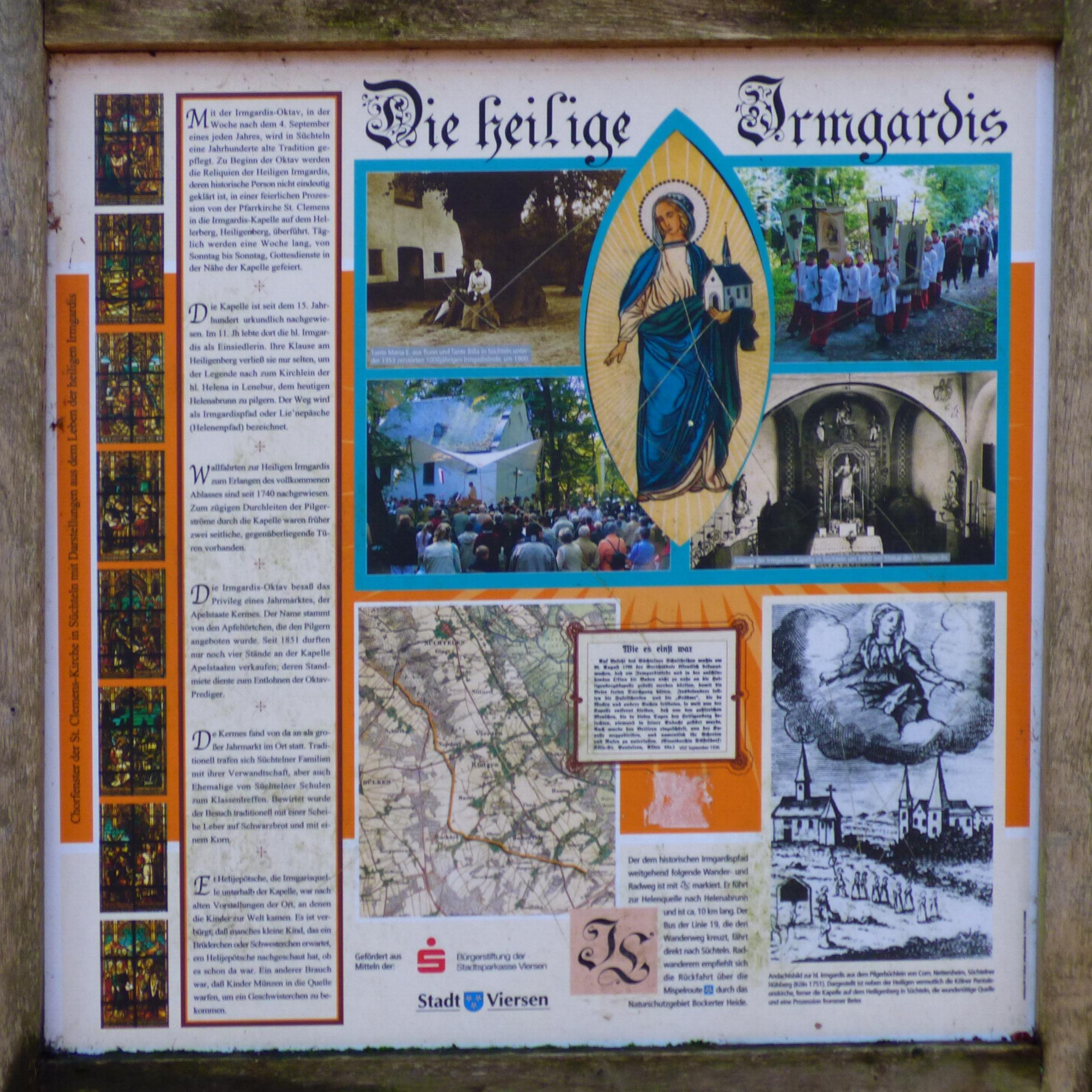 Standort: Die Informationstafel hat ihren Standort auf dem Heiligenberg in Süchteln. Kurzbeschreibung: Auf dem Heiligenberg steht in der Nähe der St. Irmgardiskapelle eine Infotafel, auf der Historische Daten und Bilder zu den Irmgardis - Wallfahrten zu finden sind. Quellenhinweis: * Dritte Ausgabe 1994: Handbuch des Bistums Aachen ISBN 3-87448-172-7