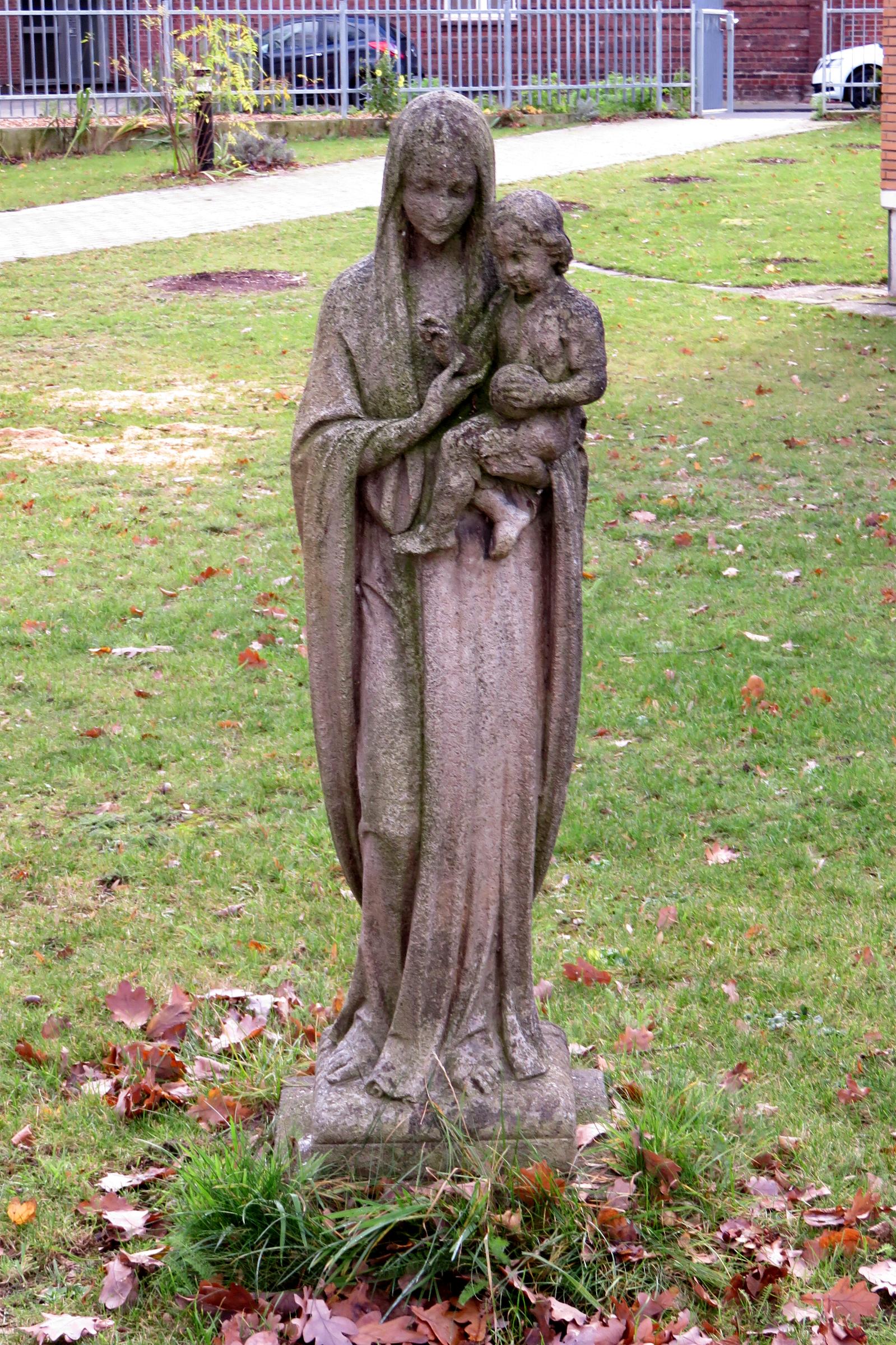 Standort: Die Madonna mit Kind hat ihren Standort im Gartengelände des St. Irmgardis Krankenhauses in Süchteln. Denkmalbeschreibung: Bei der Madonna mit Kind Figur handelt es sich um eine ca.1,20 m hohe Steinfigur auf einem Steinsockel.