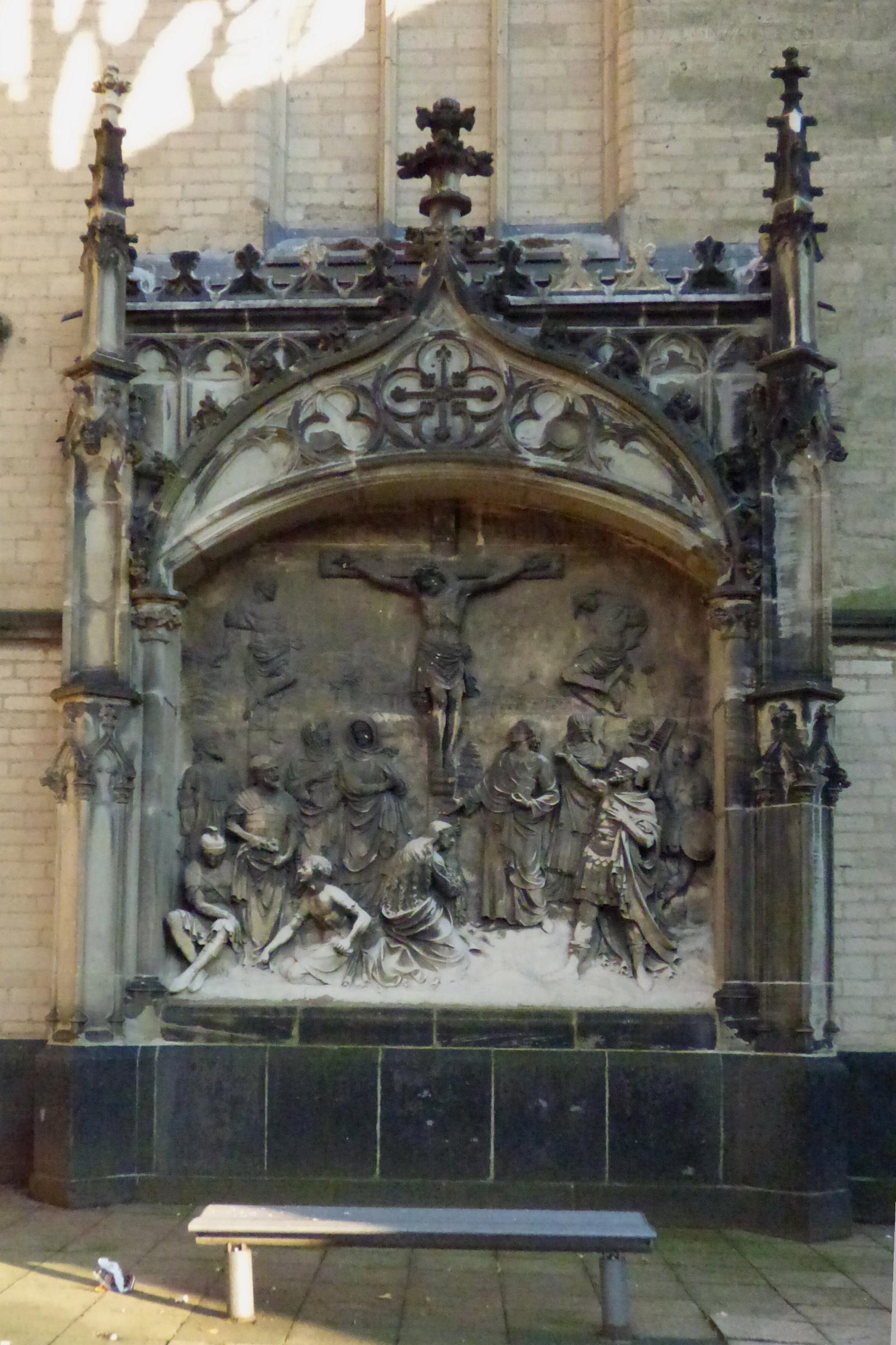 Kreuzigung als Sandsteinrelief an der Kirche St. Remigius in Viersen