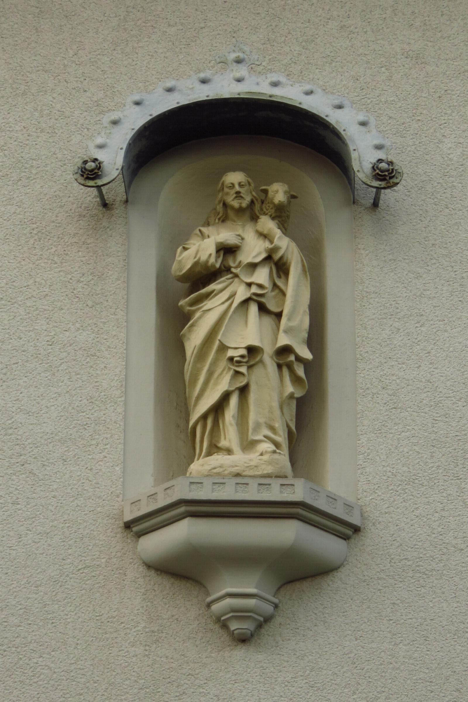 Standort und Geschichte: Die Figur des guten Hirten hat ihren Standort an der Giebelwand des ehemaligen Schwesternhauses an der Hansastraße in Mönchengladbach - Bettrath. Die etwa 1 Meter große Figur steht in einer überdachten Wandnische des Gebäudes, in dem auch das Pfarrbüro untergebracht ist. Hinweis: * Der "Guter Hirte" bei Wikipedia Quellenhinweis: * Dritte Ausgabe 1994: Handbuch des Bistums Aachen ISBN 3-87448-172-7 S. 1052