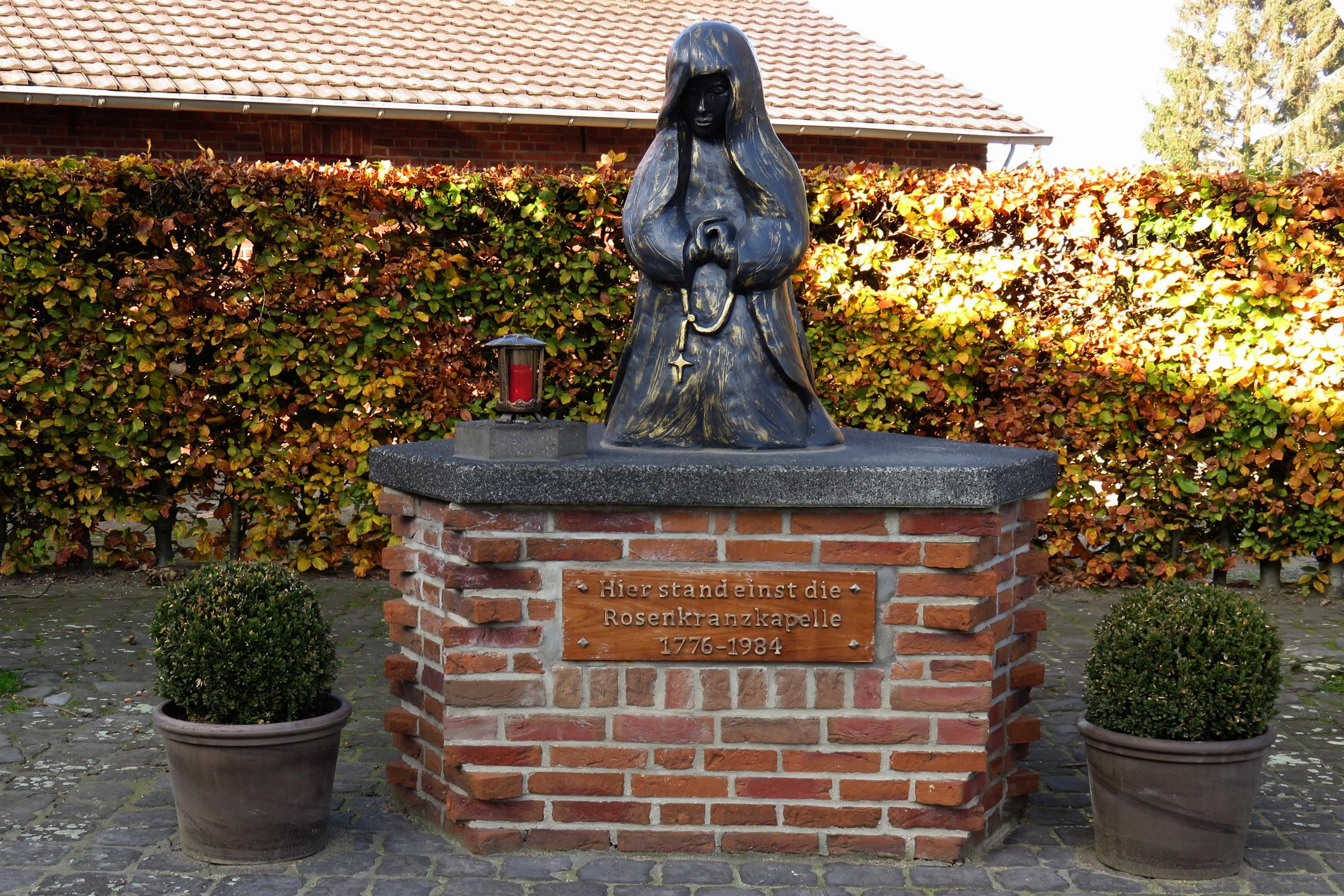 Standort und Geschichte: Die Madonnenfigur hat Ihren Standort an der Ecke Laurentiusstraße / Anhovener Straße im Ortsteil Mönchengladbach - Buchholz. Die Figur ist aus Stein und wurde von Elisabeth Jansen geschaffen. Sie wurde errichtet an Stelle des Rosenkranzkapellchen aus 1776, das 1984 abgebrochen wurde. Quellenhinweis: * Dritte Ausgabe 1994: Handbuch des Bistums Aachen ISBN 3-87448-172-7 S. 819 Die Geschichte der ersten Kapelle Die Rosenkranzkapelle wurde