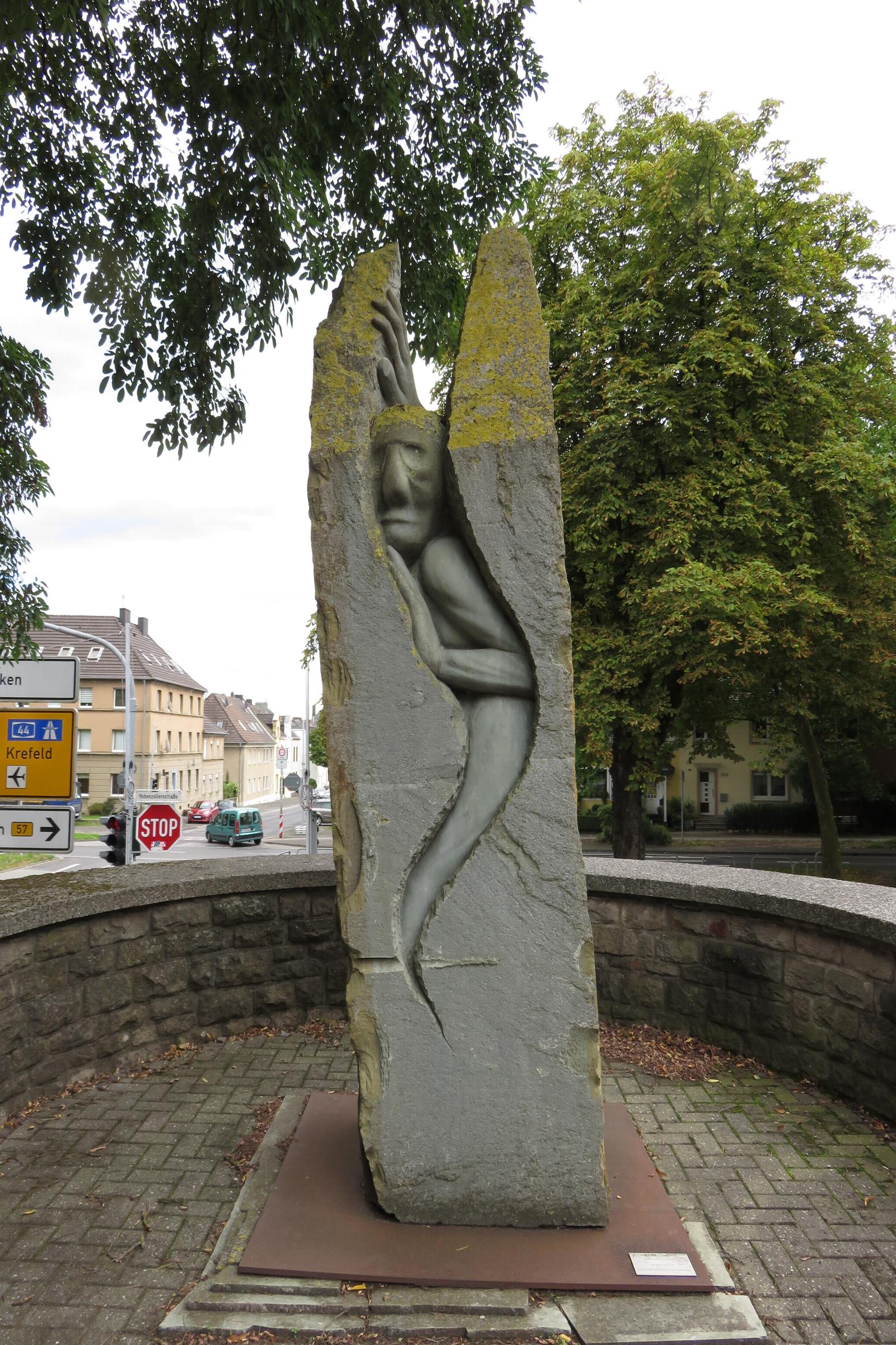 Der Mensch in der Klemme, Originaltitel: "Wiedergeburt" von Bernhard Petz aus dem Jahre 2006 Standort und Geschichte: Die Skulptur, Der Mensch in der Klemme hat seinen Standort an der Grabeskirche St. Elisabeth, an der Bergstraße 65, in Mönchengladbach - Eicken.