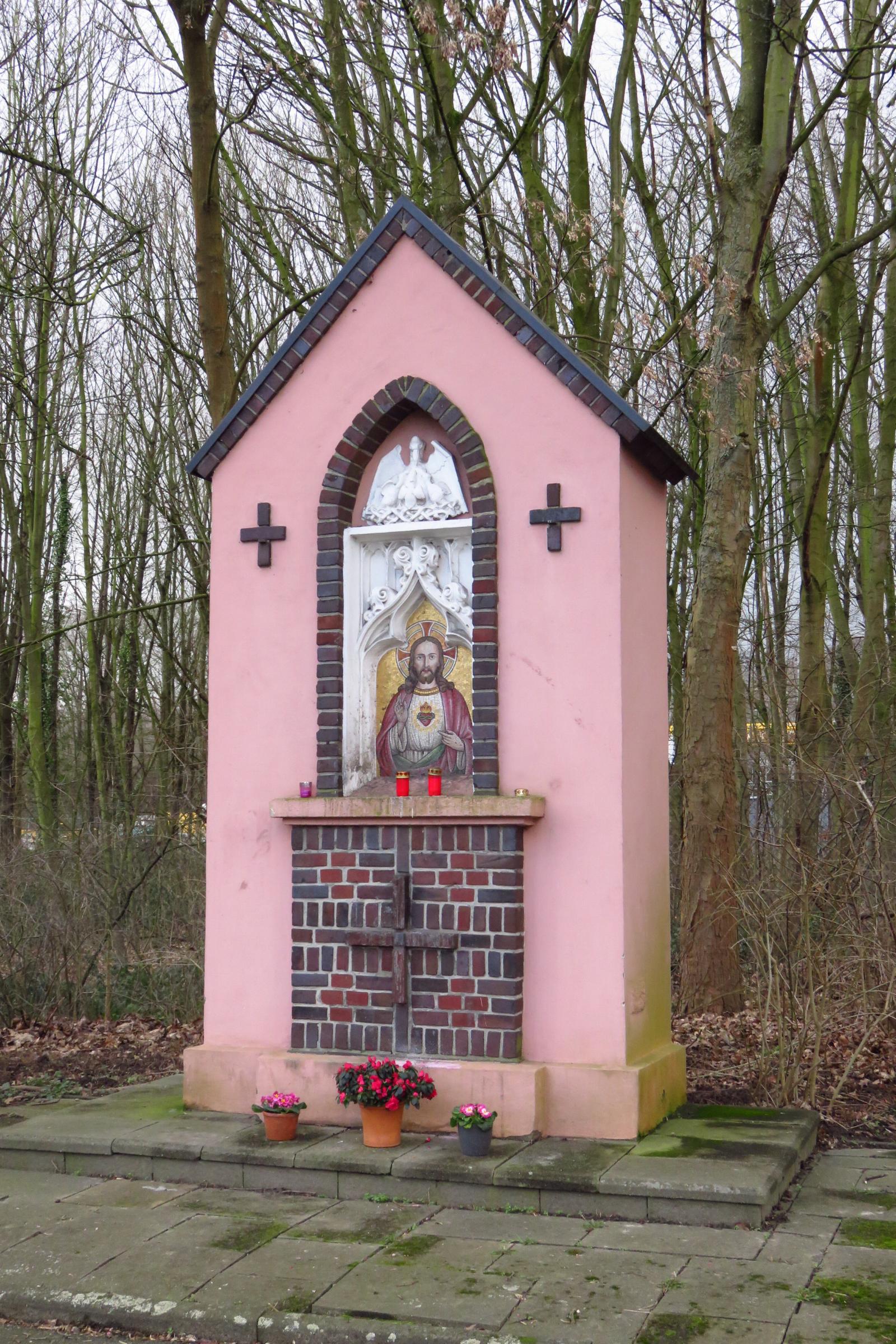 Standort: Der Herz Jesu Bildstock befindet sich an der Hubertusstraße im Stadtteil Mönchengladbach Geistenbeck. Er liegt hinter der Bahnunterführung an der Kreuzung rechts.