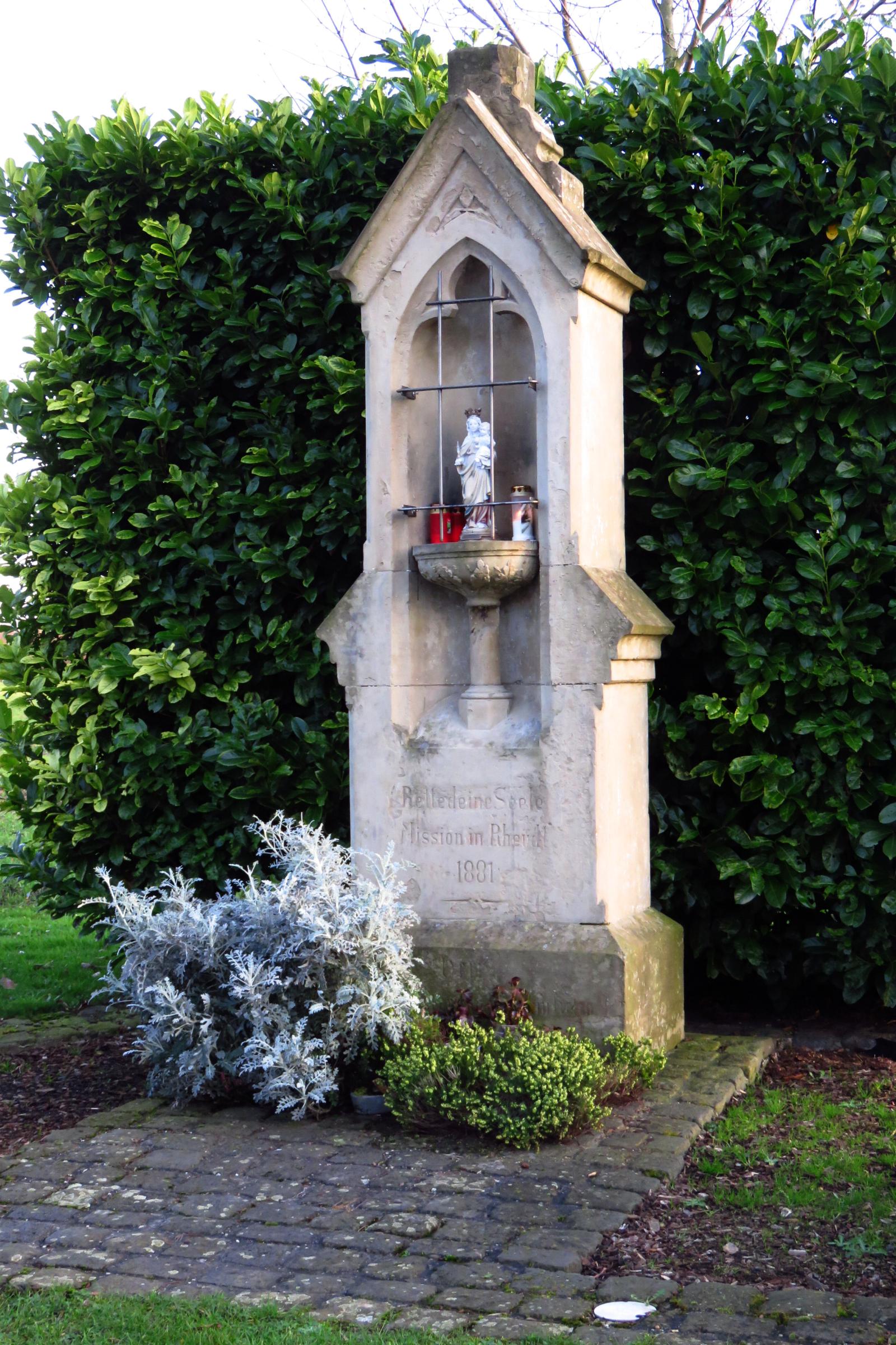 Standort und Geschichte: Der Marienbildstock hat seinen Standort In der Bungt, an den Zwölf Morgen, im Stadtteil Mönchengladbach - Hardterbroich. Er stammt aus dem Jahr 1881 und erinnert an die Mission in Rheydt. Der Spruch "Rette deine Seele ist im unteren Schaft eingelassen.