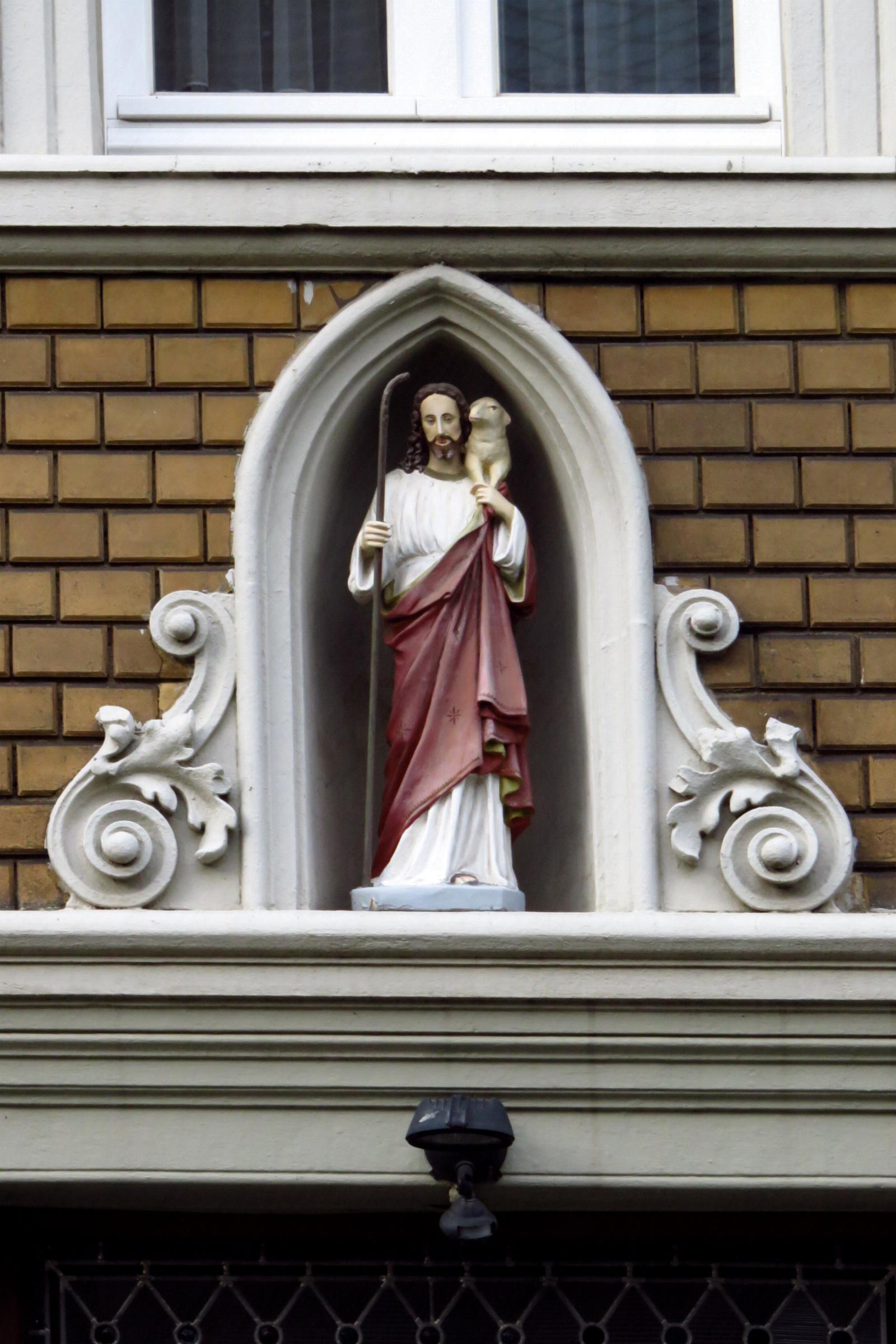 Standort: Die Figur des Guten Hirten befindet sich über dem Eingang des Pfarrhauses in Heiligenpesch im Stadtteil Mönchengladbach - Hehn. Das Pfarrhaus steht in der Denkmalliste der Stadt Mönchengladbach mit der Nr. H 068 unter Denkmalschutz.