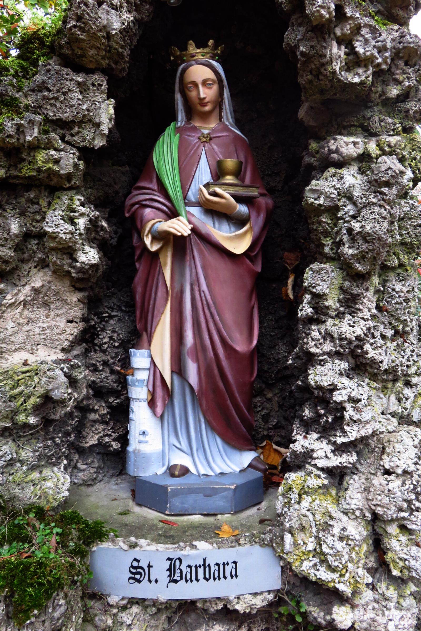 Standort: Die Figur der Heiligen Barbara befindet sich in der Grotte der Vierzehn Nothelfer in Heiligenpesch 81 b, im Stadtteil Mönchengladbach - Hehn. Die Grottenanlage steht in der Denkmalliste der Stadt Mönchengladbach mit der Nr. H 036 unter Denkmalschutz. Kurzgeschichte: Der Legende nach wurde die Heilige Barbara in einem Turm eingesperrt, grausam misshandelt und vom eigenen Vater enthauptet. Sie gilt als Helferin gegen jähen Tod, Blitz, Feuer und Fieber. Sie ist die Patronin der Bergleute, der Schmiede, der Feuerwehrleute u.a.m. Dargestellt wird sie mit Kelch, Turm und Palme. Fest am 4. Dezember. Quellenangabe: Die Vierzehn Nothelfer (150 Jahre Pfarre St. Mariae Heimsuchung in MG-Hehn)
