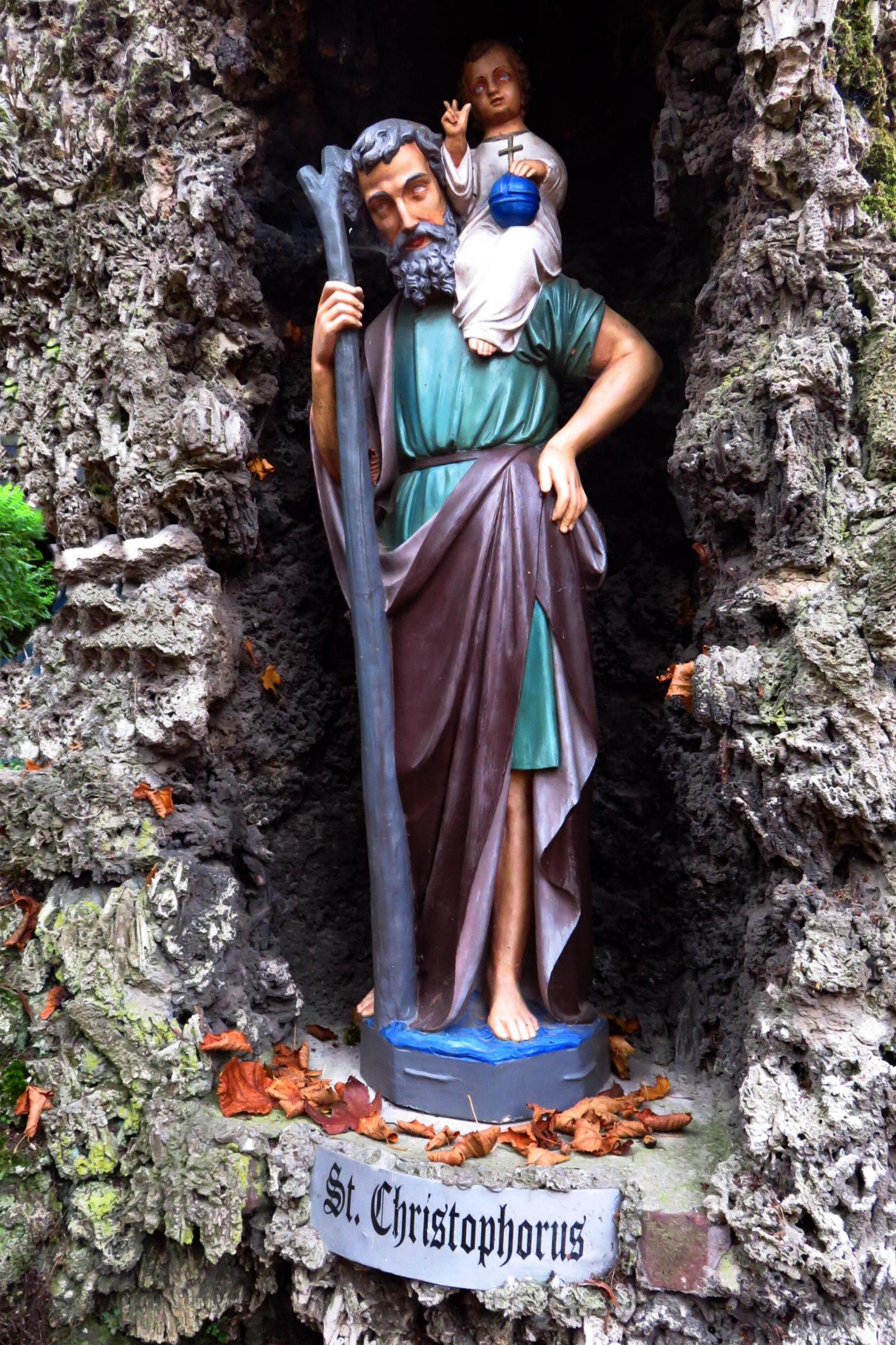 St. Christophorus Figur in der Grotte in Hehn Standort: Die Figur des Heiligen Christophorus befindet sich in der Grotte der Vierzehn Nothelfer in Heiligenpesch 81 b, im Stadtteil Mönchengladbach - Hehn. Die Grottenanlage steht in der Denkmalliste der Stadt Mönchengladbach mit der Nr. H 036 unter Denkmalschutz. Kurzgeschichte: 452 wurde nach Christophorus in Chalkedon eine Kirche benannt. Er ist Helfer gegen jähen Tod, Hochwasser, Unwetter, Hungersnot, Pest, Wunden, Zahnschmerzen. Er ist Patron der Seeleute, Pilger, Reisenden, des Verkehrs, der Buchbinder, Färber, der Zimmerleute u.a.m. Er wird dargestellt mit Baum in der Hand, das Jesuskind auf der Schulter. Fest am 25. Juli. Quellenangabe: Die Vierzehn Nothelfer (150 Jahre Pfarre St. Mariae Heimsuchung in MG-Hehn)